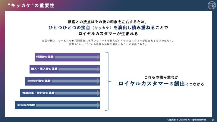 ひとつひとつの顧客との接点(キッカケ)を最適化しこれを積み重ねることが重要。