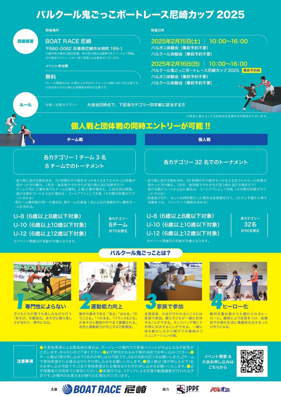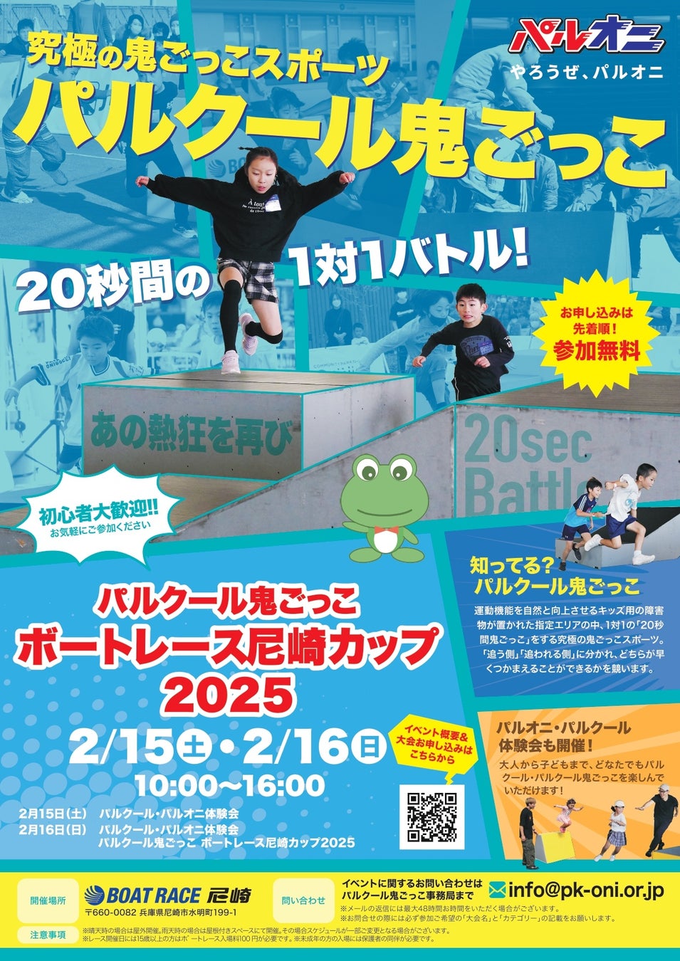 2025年2月15日(土) 10:00〜16:00 パルクール鬼ごっこボートレース尼崎カップ2025(事前予約制) パルオニ体験会(事前予約不要) パルクール体験会(事前予約不要) |