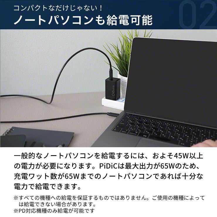 ノートパソコンもスマホも、PiDiC65を使えばどちらも給電できるため、近年増えた「働く場所を選ばない」新しい働き方の強い味方です。
