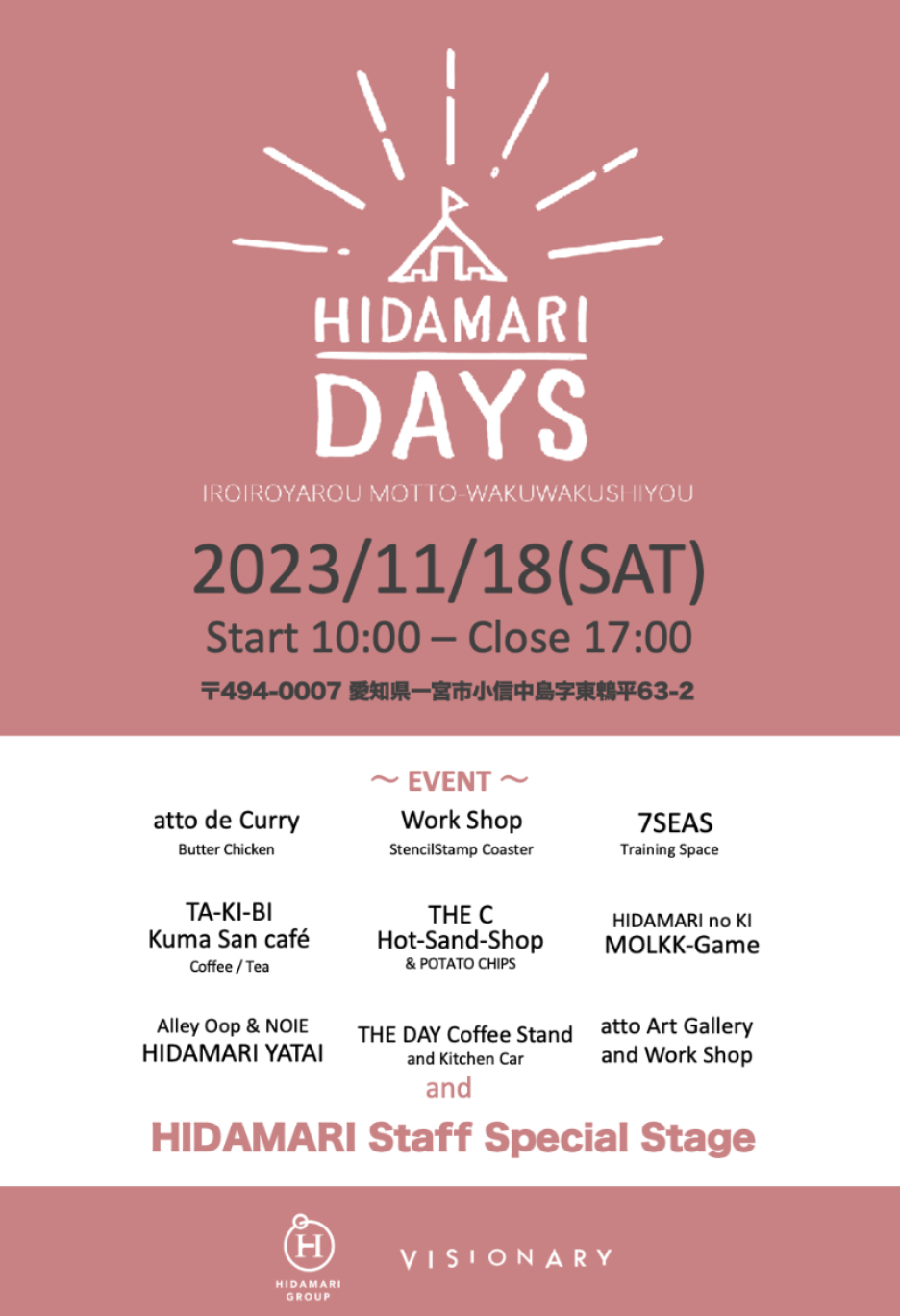 HIDAMARI GROUPを運営する株式会社ビジョナリー(代表取締役社長/丹羽 悠介、本社:愛知県名古屋市)は、2023年11月18日(土)に愛知県一宮市にて、大規模イベント“HIDAMARI DAYS”を開催いたしました。本イベントは日頃より障害福祉サービスを利用する方々やそのご家族、関係してくださっているすべての方々への感謝を伝える場、そして一人でも多くの方に福祉は楽しいものであるということを伝えたいという想いのもと、去年よりスタートしたビジョナリー主催の大規模イベントです。