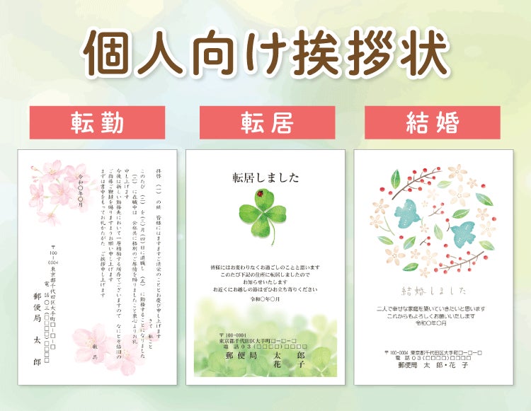 新生活の報告に使用する転居や結婚報告などの個人向け挨拶状から、開業や独立報告などの法人向け挨拶状まで、用途別のデザインを豊富にそろえています。