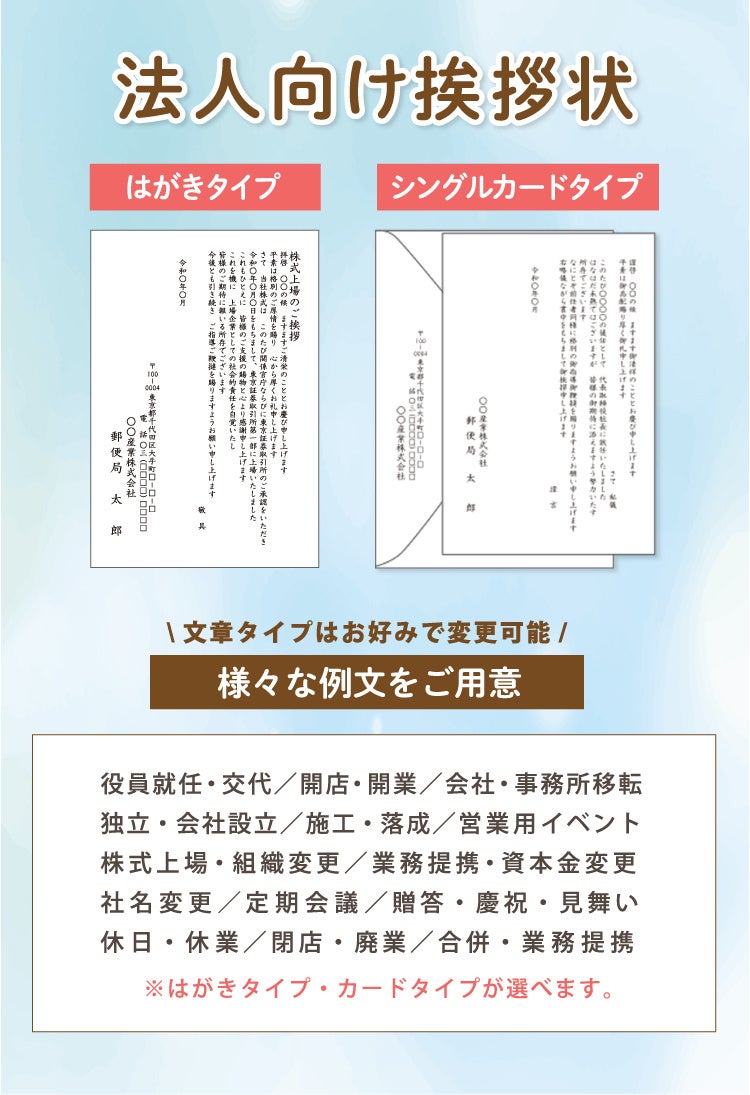 あらゆるビジネスの場で活用できる挨拶状。用途に合わせた文章、はがきや封書のタイプをご用意しています。文章はお好みに合わせて変更可能です。