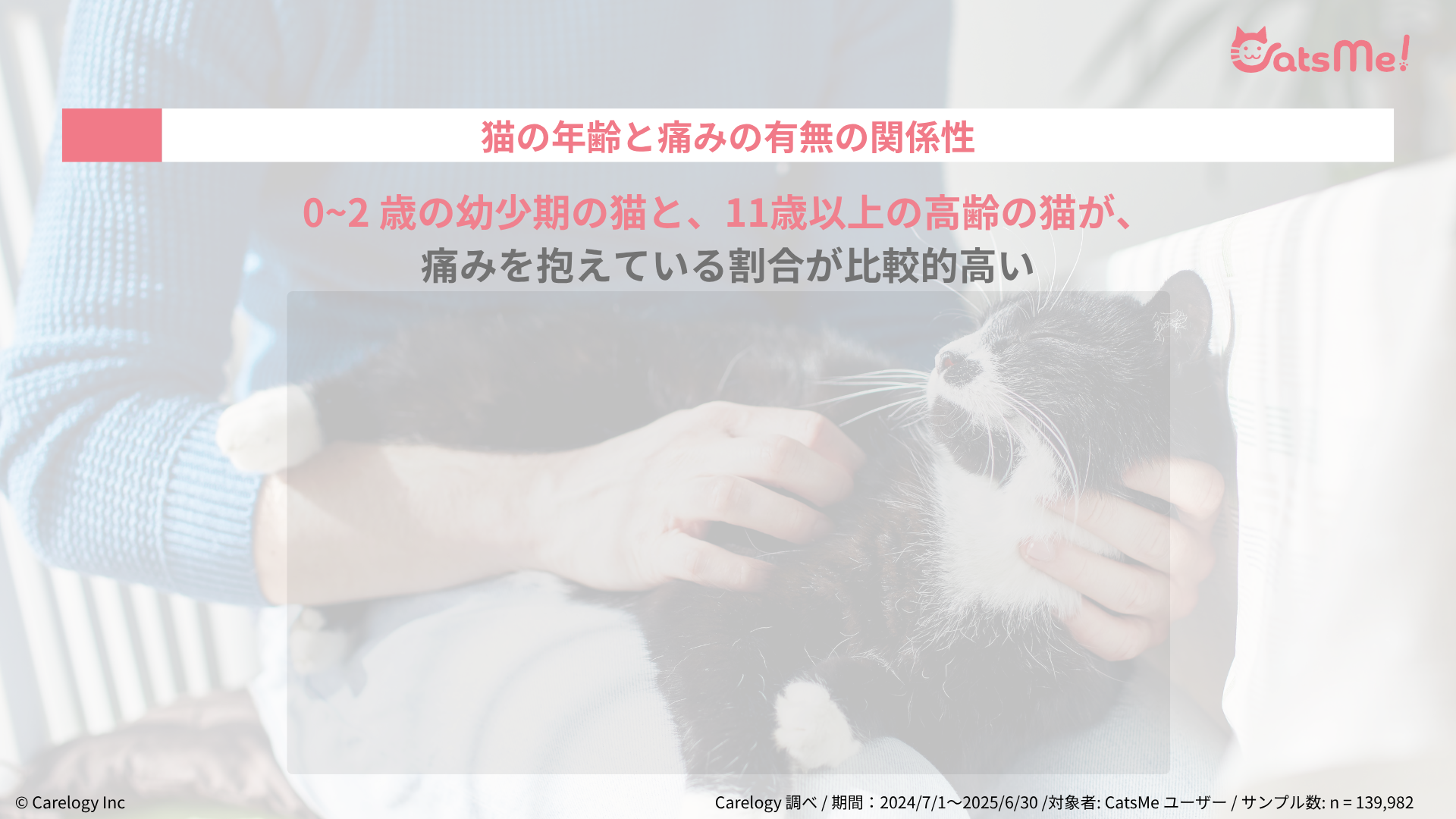 調査方法 : ユーザーについて個人情報の匿名化処理を施したうえ、CatsMe 上に登録されている猫のデータ・AI 判定の結果・健康情報のデータなどについて統計的な分析を実施