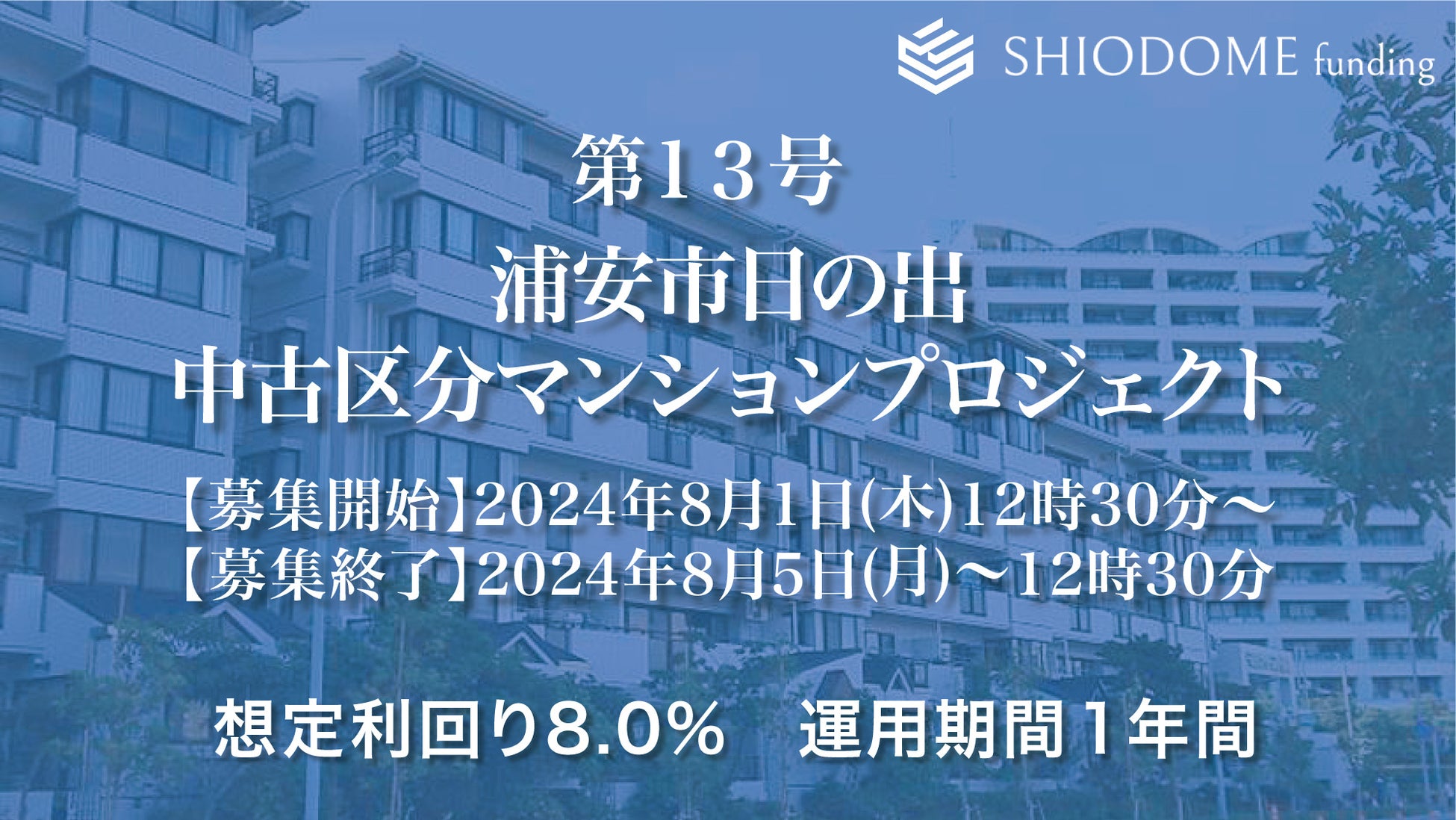 汐留プロパティ株式会社(代表取締役社長:大原龍/本社:東京都港区東新橋一丁目5番2号 汐留シティセンター33階、以下、「当社」。)はネットで完結する不動産投資クラウドファンディング「汐留funding」において、第13号プロジェクトとなる「浦安市マンションプロジェクト」(以下、「本プロジェクト」。)の情報を公開しましたのでお知らせします。
