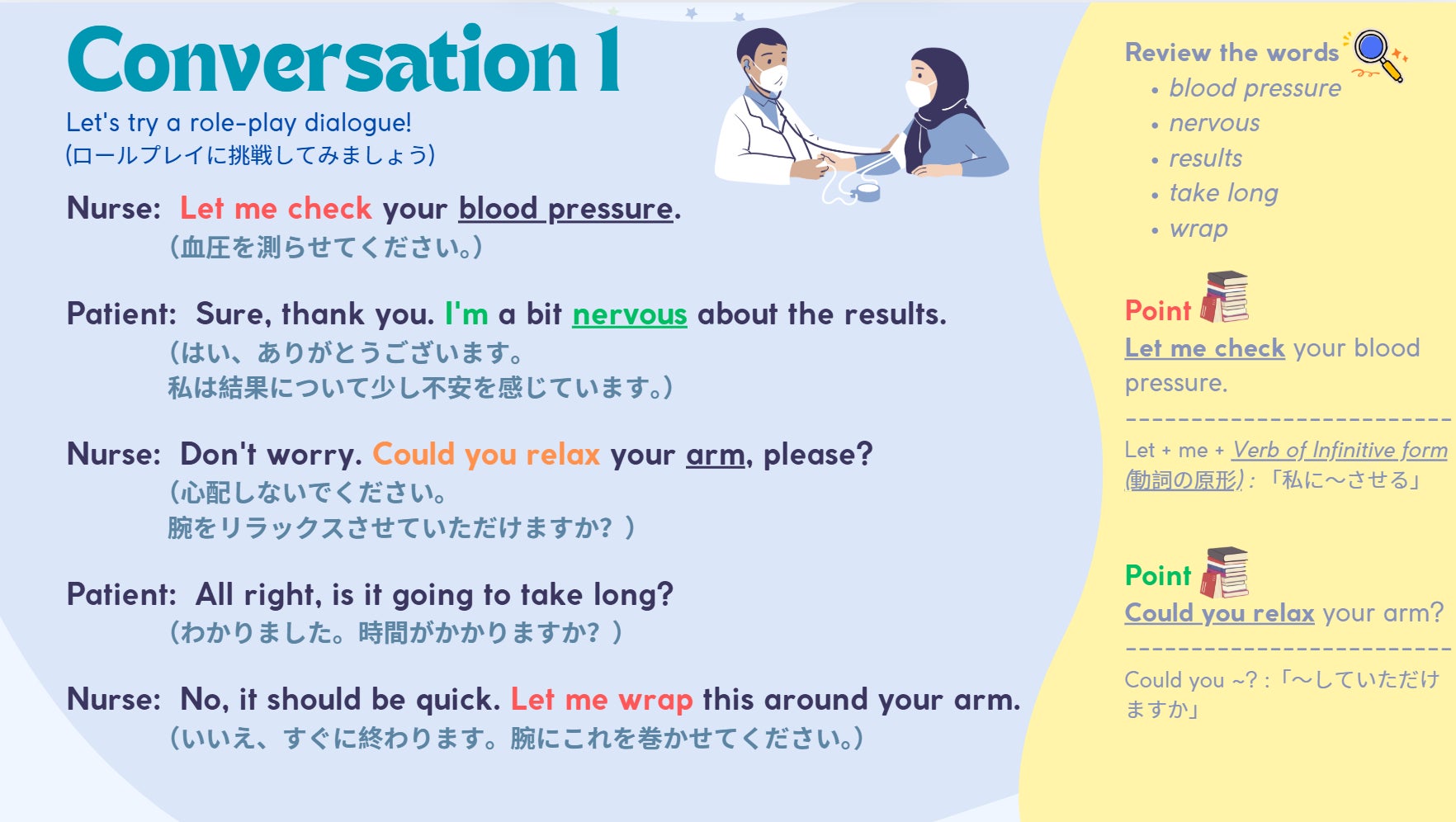 基礎的な文法を使用しながらも、医療現場を想定した表現や単語が使用されています。