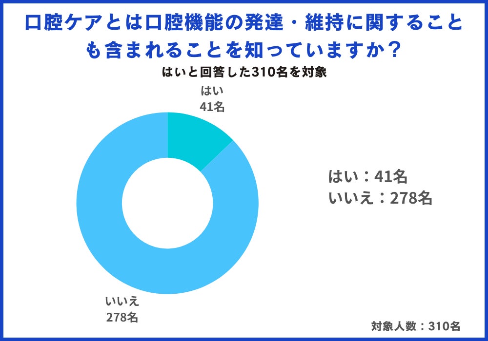 また、口腔ケアという言葉は知っているものの、口腔機能の発達や維持にも関与することまで認知している方は少なく、口腔ケアを知っていると回答したグループ310名の内41名という結果になっております。