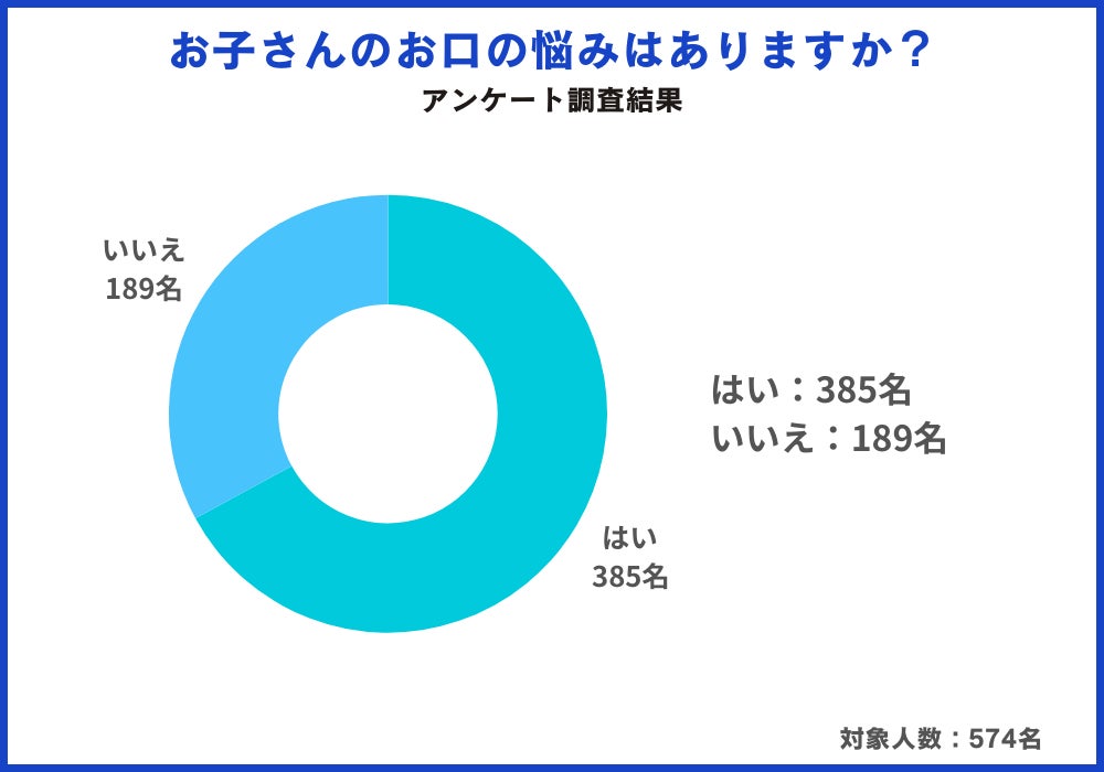 本調査をした結果、お子様の口の悩みを持つ方は、574名中385名という結果になった。子どもの口腔ケアに対して何かしらの悩みをもつ家庭が多いという結果となりました。