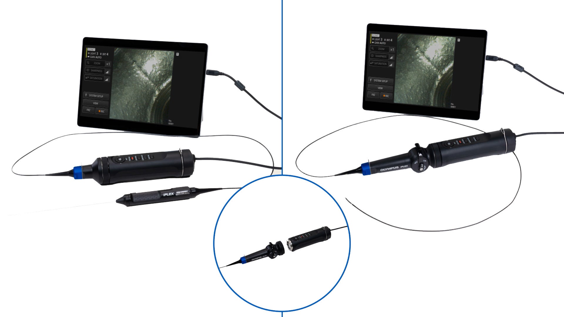 フレキシブルスコープ(軟性鏡)は柔軟性があり狭く入り組んだ箇所の観察に、リジットスコープ(硬性鏡)は曲がらない性質を持ち細くて長い空間の観察に適していますが、本製品は、これらを一つのプラットフォームで対応可能にしました。従来2台のシステムを使用して行っていた観察を1台で完遂できることで、より幅広い検査シーンに対応し、検査の効率化に貢献します。