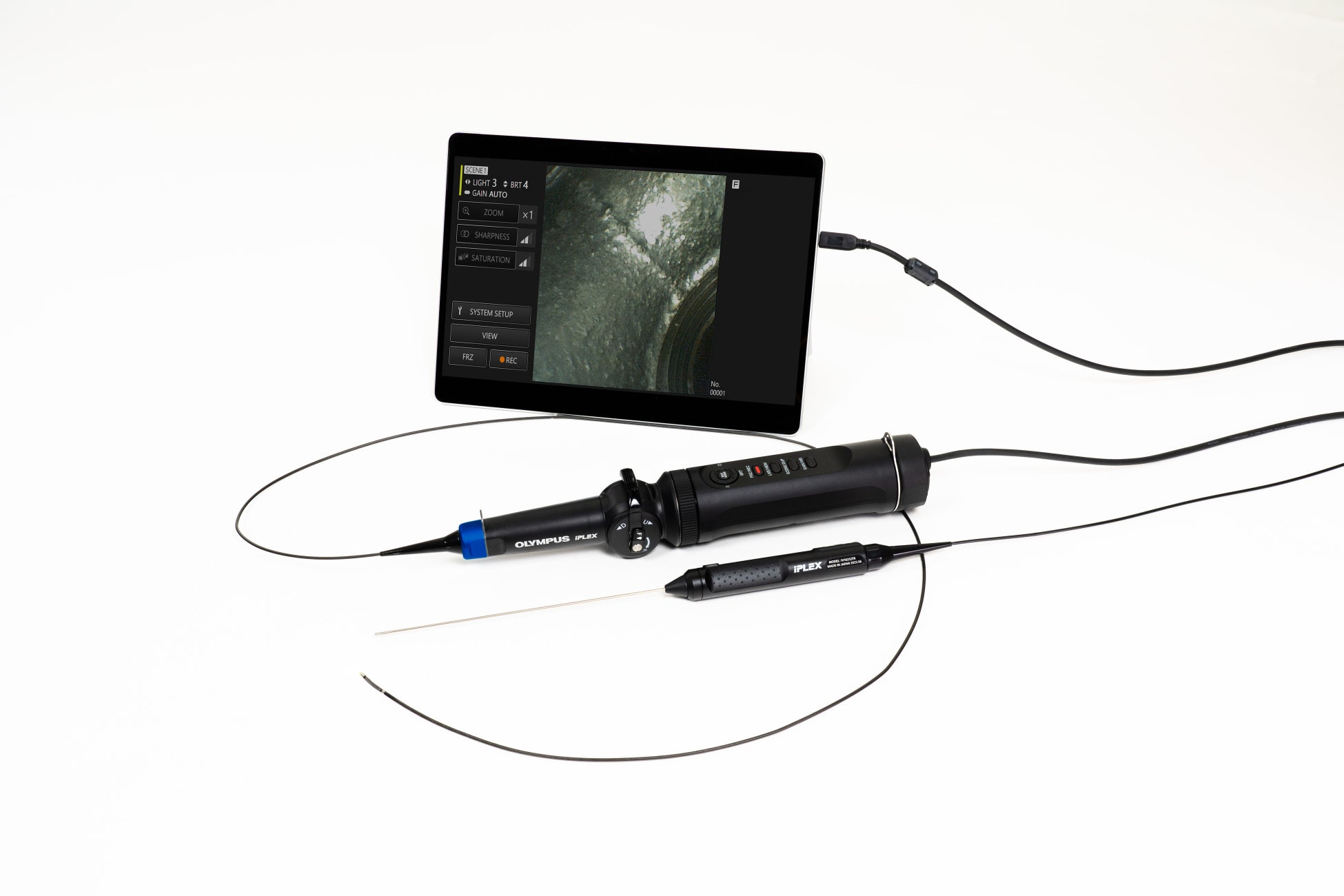 今回発売する「IPLEX TX II」は、シリーズ初となるタブレット端末※に対応した製品です。本体から得たさまざまなデータを、タブレットを使用してリアルタイムで見える化・分析することができ、製造現場のIoT(Internet of Things:モノのインターネット)システム構築のサポートに寄与します。また、自動車や航空機の製造工程における部品検査に適したサイズ、先端に新開発の湾曲機構を採用した耐久性ある設計にすることにより、ユーザーの操作感向上を目指しました。これにより、作業者の経験による検査のばらつきを抑え、安定した生産に貢献します。さらに、本製品はフレキシブルスコープ(軟性鏡)とリジットスコープ(硬性鏡)の付け替えができ、現場ニーズに合わせた選択が可能です。