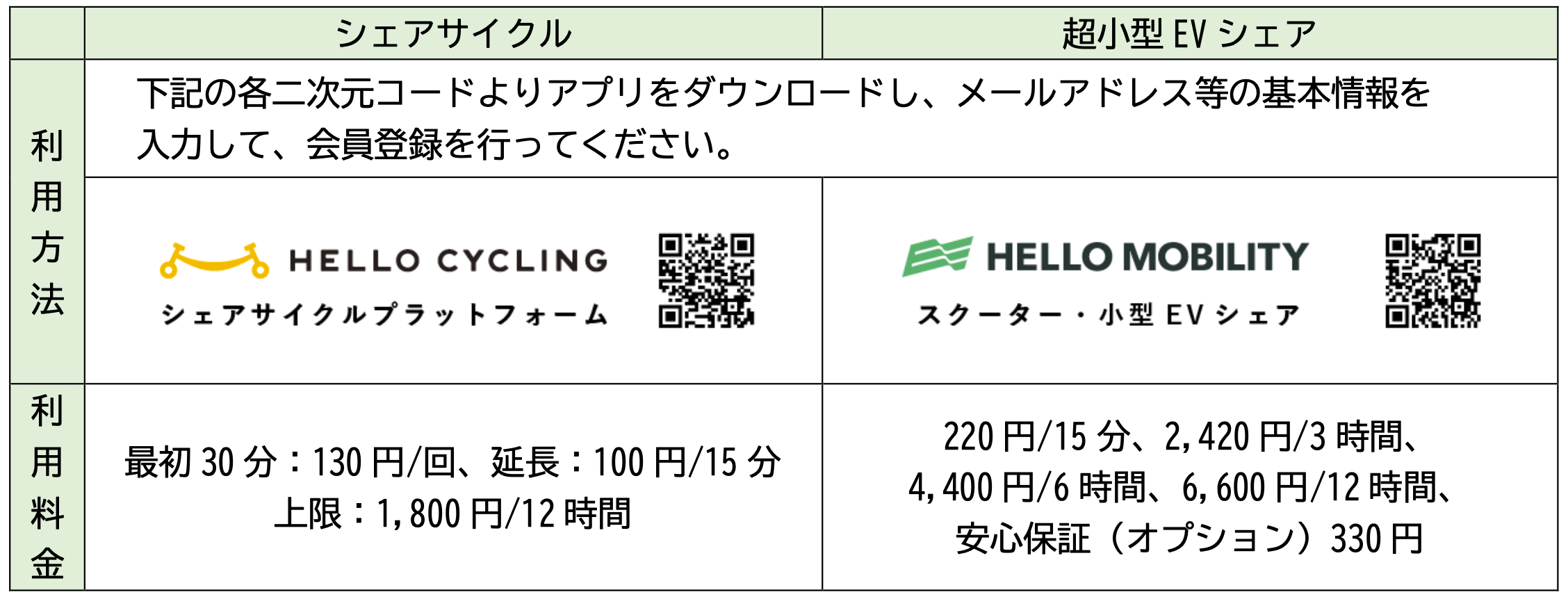 シェアサイクルと超小型EVシェアの利用は、OpenStreetが提供するシェアモビリティプラットフォーム「HELLO CYCLING」「HELLO MOBILITY」のアプリより、ポート場所の確認や利用予約が可能で、利用者の皆様にとって相互に乗り換えがしやすい移動サービスを提供します。