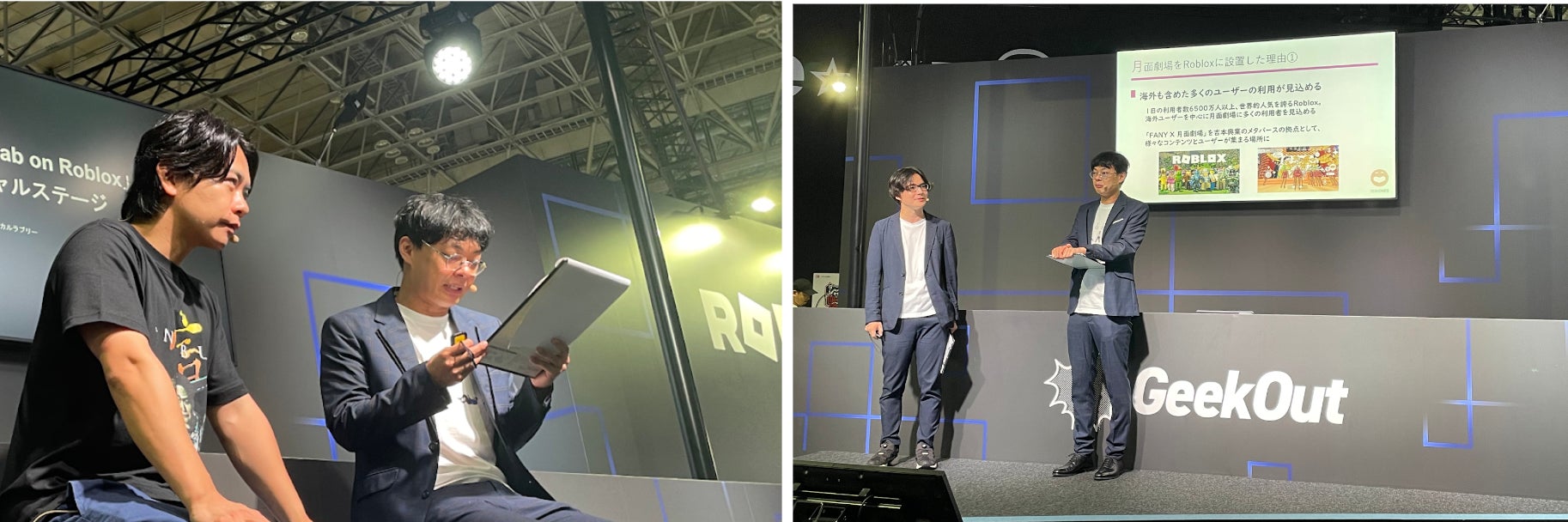 GeekOut 代表取締役の田中の挨拶の後、Roblox社のTian Lim氏によるRobloxが持つ可能性と日本市場に向けた展望についてのプレゼンテーションに始まり、Head of Roblox JapanのAri Staiman氏と吉本興業の100%子会社株式会社であるFANY 代表取締役社長の梁氏によるパネルディスカッション「Robloxで可能となる没入型体験とは?」では、吉本興業のRobloxタイトル紹介と共にタレントがRobloxで活躍できる可能性について語られました。