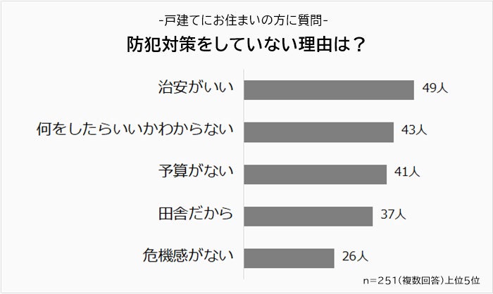 「防犯対策をあまりしていない・全くしていない」と回答した人の理由1位は「治安がいいから(49人)」。2位は「何をしたらいいかわからない(43人)」でした。3位「予算がない(41人)」、4位「田舎だから(37人)」、5位は「危機感がない(26人)」でした。