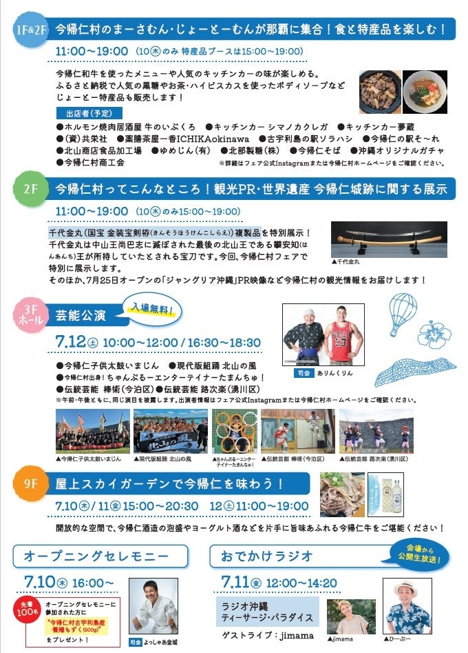 10日(木)はオープニングセレモニー、11日(金)はラジオ沖縄「ティーサージ・パラダイス」の公開生放送、12日(土)は入場無料の芸能公演など、今帰仁村のまーさむん(おいしいもの)・じょーとーむん(いいもの)を存分に味わえる3日間となっております。
