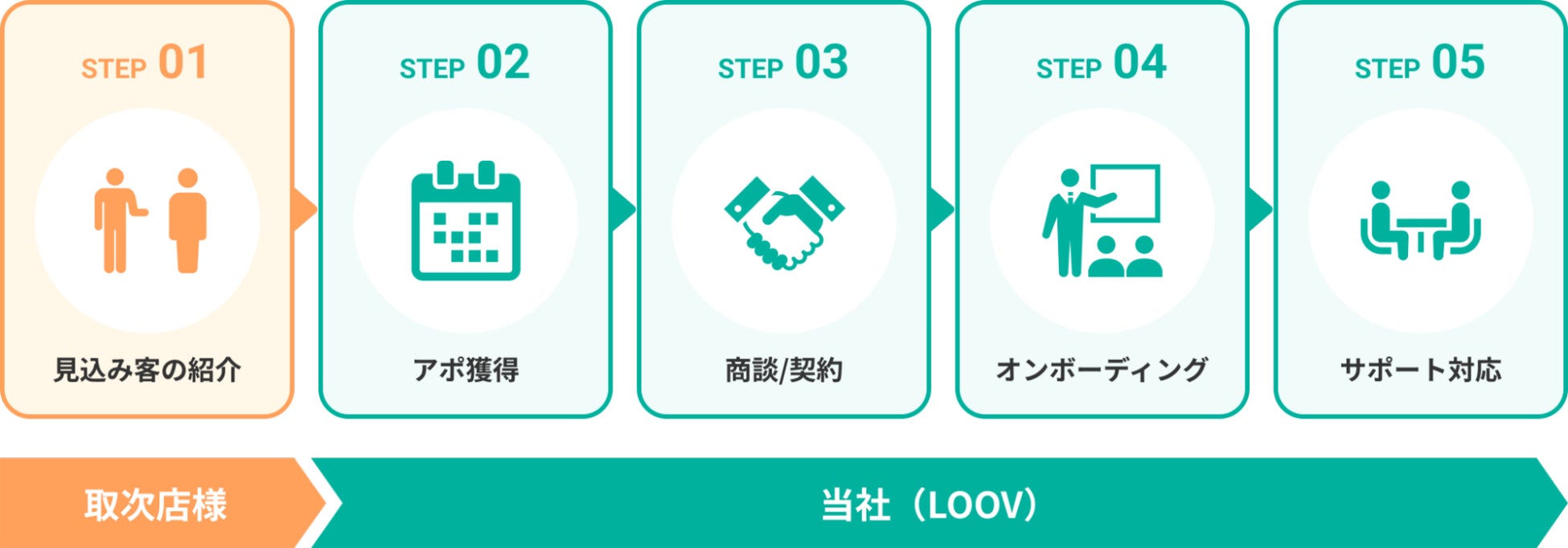 クライアント様のご紹介後、初回商談からクロージング、導入後のサポートは当社が担当いたしますので、手離れよく、必要最低限のリソースでの収益確保が可能です。