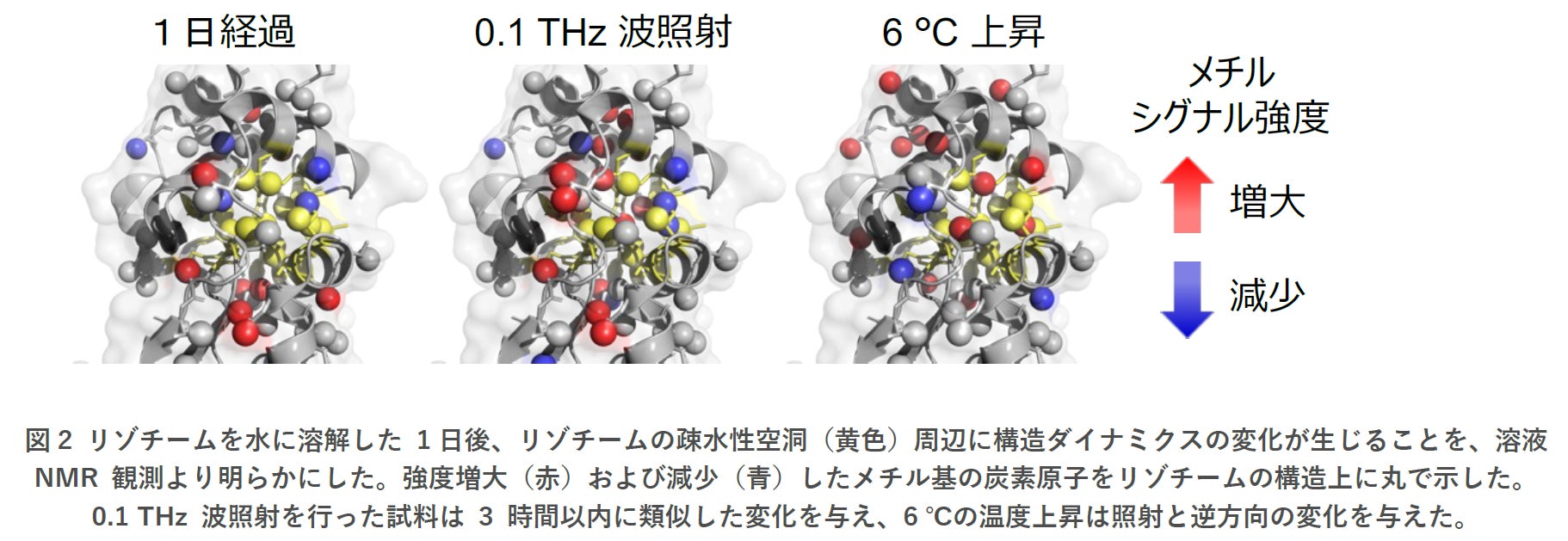 さらに研究グループは、リゾチーム試料へのsub-THz波照射作用をNMR 分光法で調べました。リゾチームに由来するNMRシグナル強度の経時的な変化は、電磁波を照射した場合と試料を熱伝導で加熱した場合で異なりました。照射による短時間の変化は、水とリゾチームを混ぜてからの時間を1日まで長くした変化と類似していることがわかりました(図2)。それだけではなく、リゾチーム構造中の各メチル基のシグナルの強度変化に着目すると、リゾチームの疎水性空洞の周辺に位置するメチル基において顕著な運動変化が生じていることがわかりました。このことから、sub-THz波照射による水和状態の変化は、特に疎水性空洞で起きていることが示唆されました(図2)。
