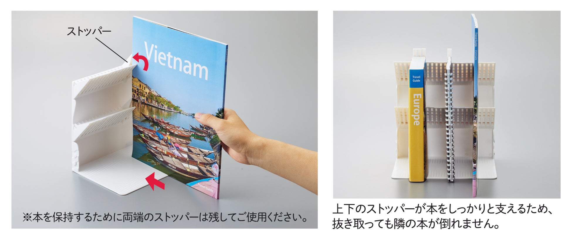 1冊でも倒れないブックスタンドは2022年10月の発売以来、少ない収納物を簡単に自立させることのできる機能性に大変ご好評頂いております。その中で『絵本や雑誌なども収納したい』『デスク上でファイルを立てて使用したい』などのお声を頂いておりました。そこで、ストッパーを2段設計にすることで、A4サイズ程度を収納可能となった新サイズを追加いたします。