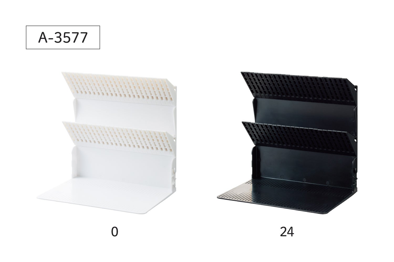 1冊でも倒れない便利な機能はそのままに、ファイルや雑誌などに対応した新サイズをブラック・ホワイトの2色で追加致します。