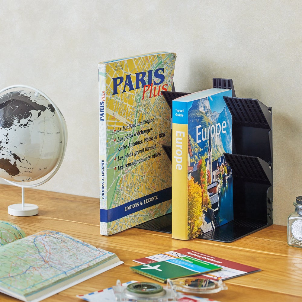 本などの収納物を差し込むだけで、ストッパーが持ち上がり本を支える機能性はそのままに、上下2箇所になったストッパーがしっかりと収納物を保持し、A4サイズの薄い雑誌も安定して立てられます。本体の両サイドのジョイントで複数台を連結でき、既発売のスタンダードサイズ(A-3575)との連結も可能です。