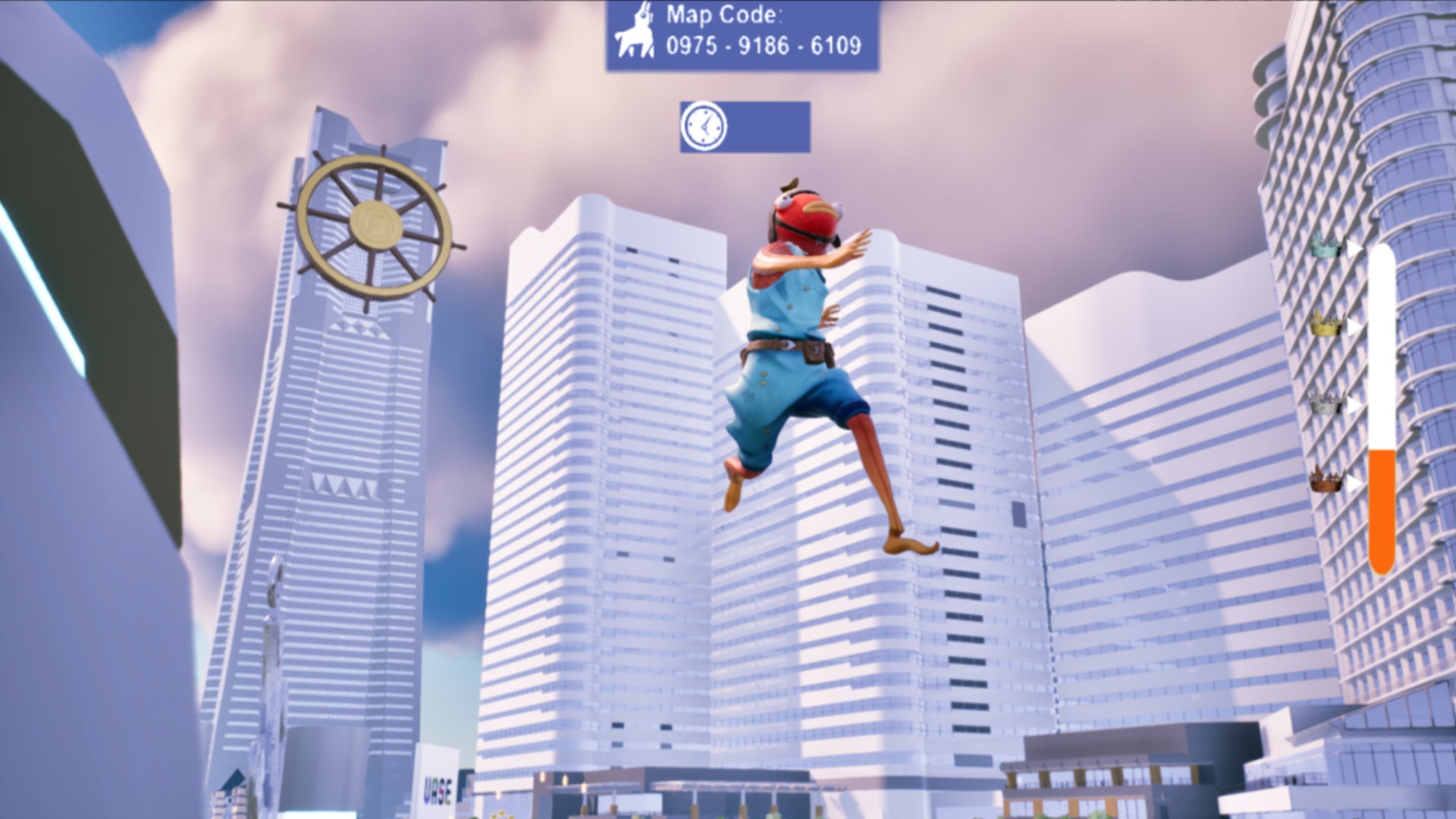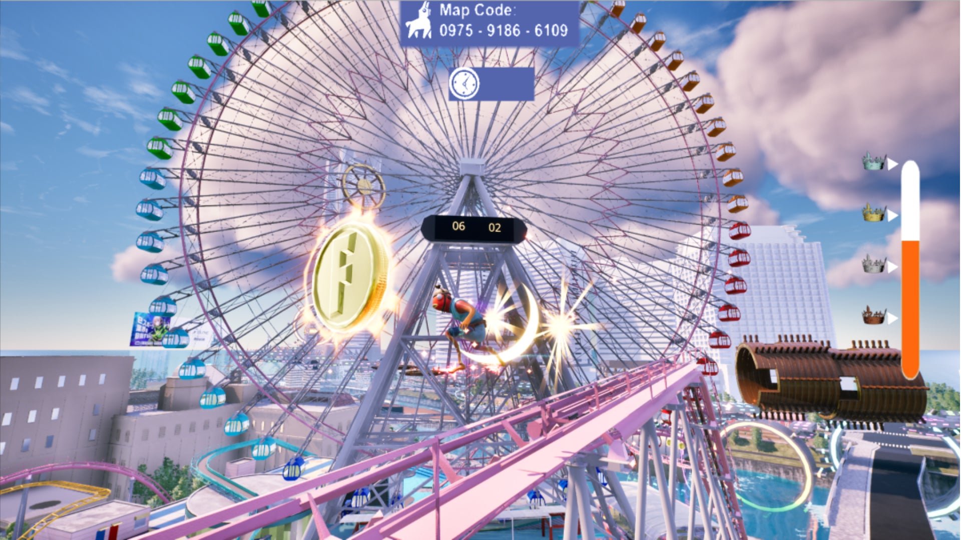 横浜開港祭2024で行われるタイムアタックパルクール大会を実施するためのメタバース空間です。みなとみらいを舞台としたコースで3分以内にゴールを目指しながら、コインを集めそのスコアを競うものとなっています。