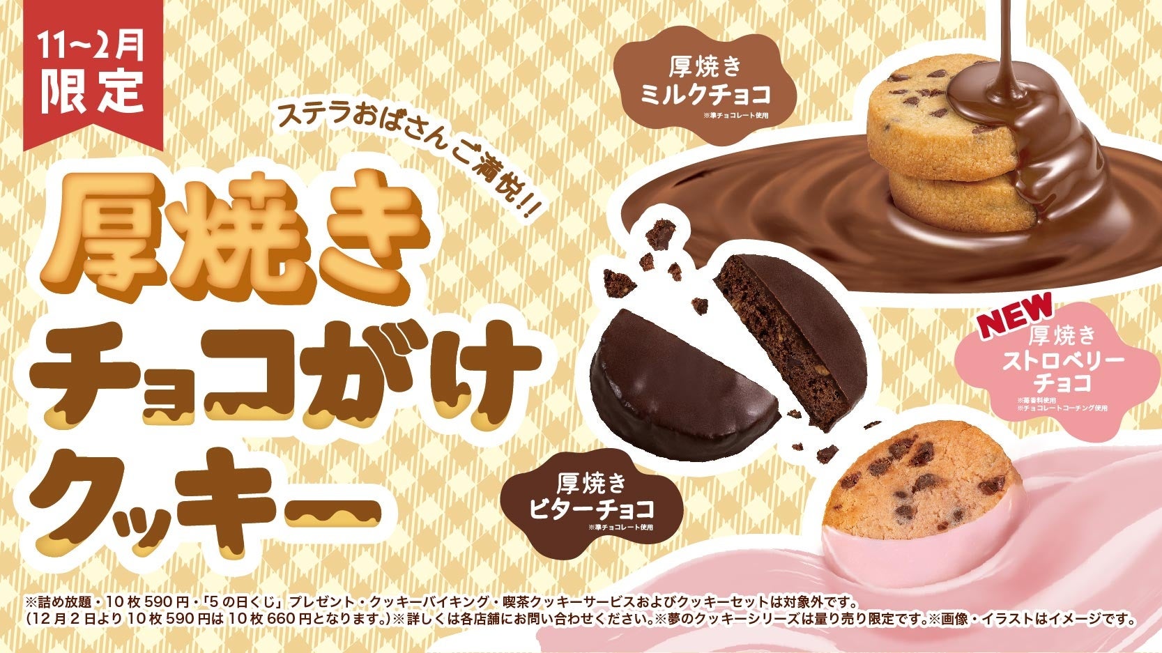 森永製菓株式会社(本社・東京都港区、代表取締役社長・太田栄二郎)のグループ会社で、アメリカンカントリー焼き菓子専門店『ステラおばさんのクッキー』を展開する株式会社アントステラ(本社・東京都港区、代表取締役社長・村瀬光隆)は、「ステラおばさんが夢のクッキー作っちゃったプロジェクト」第12弾において、いつもより欲張りに厚焼きにした人気のクッキーにチョコをコーティングした≪厚焼きチョコがけクッキー≫3種を2024年11月15日(金)~2025年2月28(金)の期間限定で発売いたします。