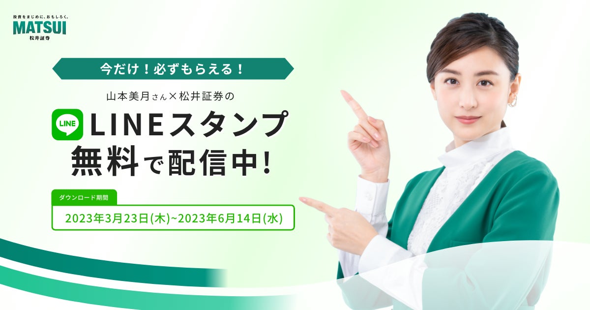 松井証券(以下「当社」)は、2023年3月23日(木)より、当社イメージキャラクターである山本美月さんとコラボしたLINEスタンプの配布を開始しました。山本美月さんのさわやかな笑顔とあわせて使いやすい「OK」「ありがとうございます」の他、「爆アゲ」「損切り」など日常生活でも自然に使える株式取引ワードも織り交ぜています。期間中、どなたでも無料でダウンロードできますので、ぜひこの機会にご家族・ご友人とのメッセージでご使用ください。