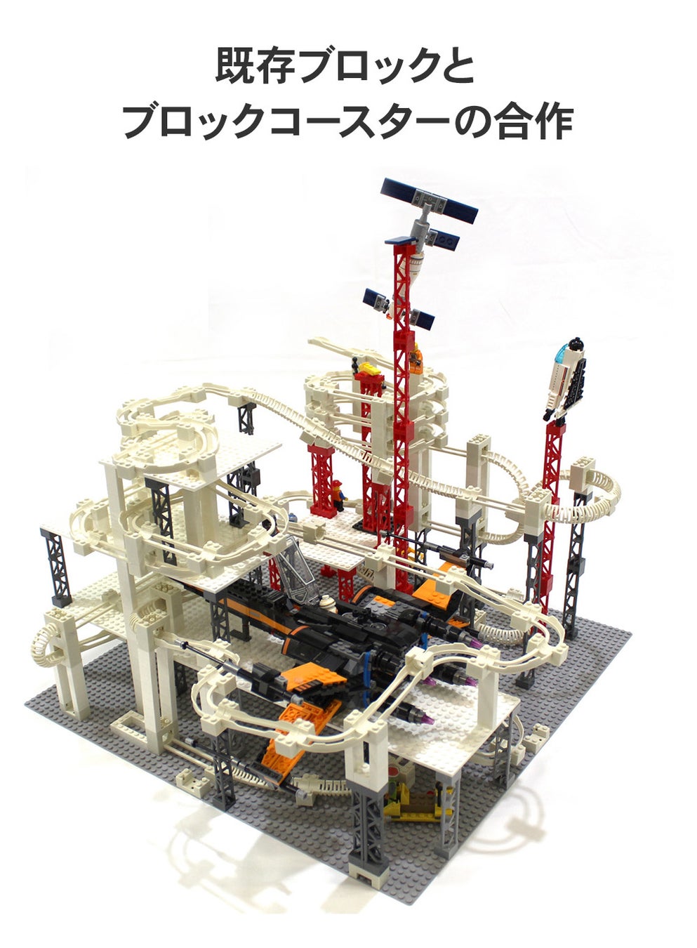 「各社ブロック互換サイズ。縦に組立ててボールが疾走するブロックコースター」