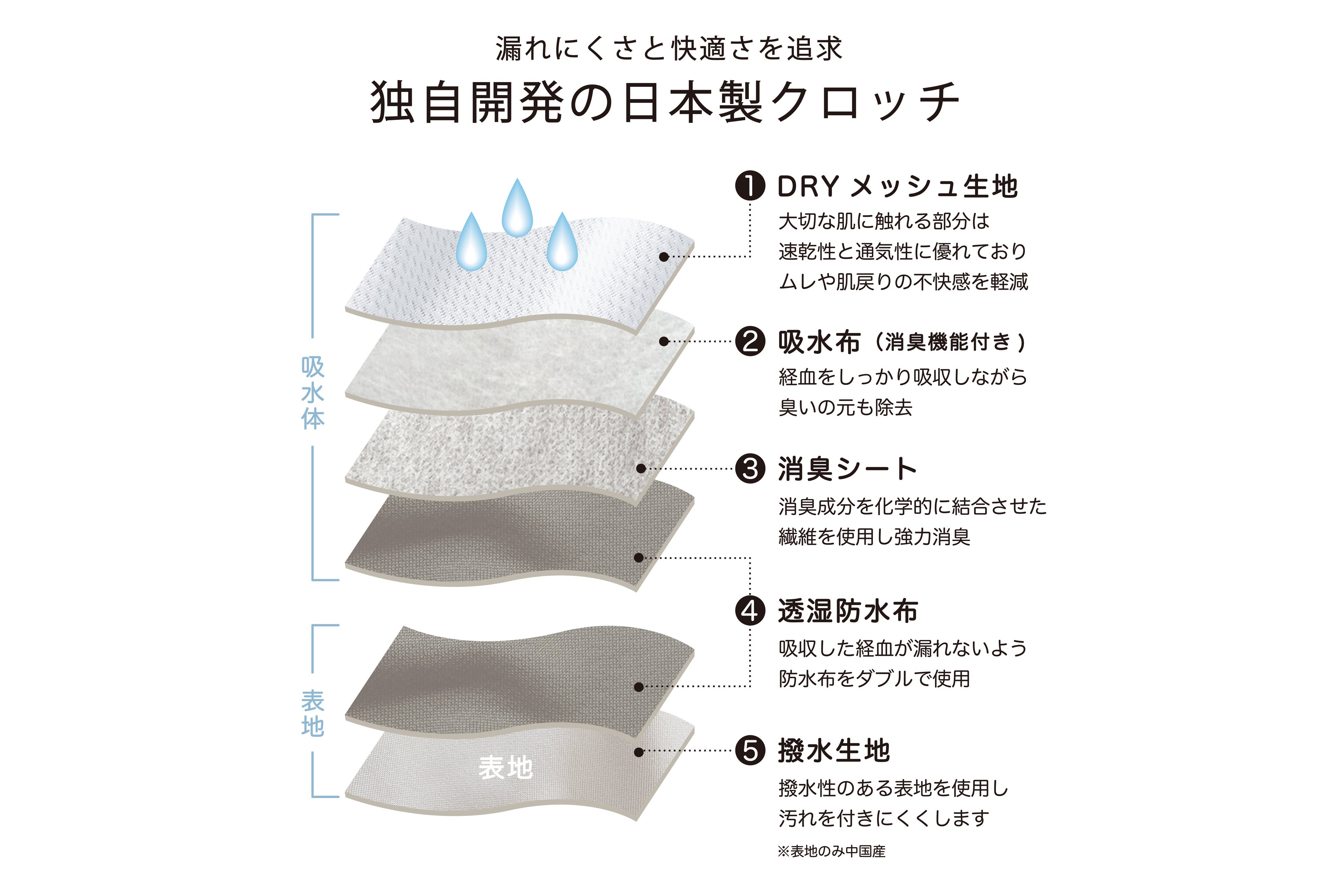 吸水体には、厳選した日本製の機能生地を使用し、肌との接触面の快適さ・吸水力・ムレの軽減・消臭力に優れたÉCRUオリジナルのクロッチを採用しています。