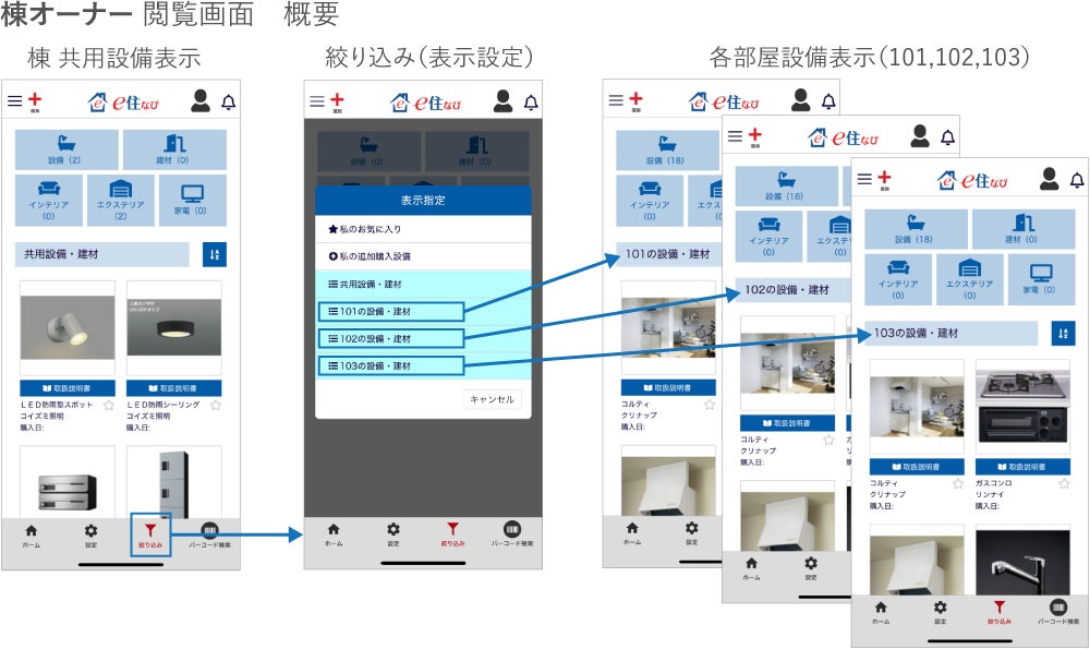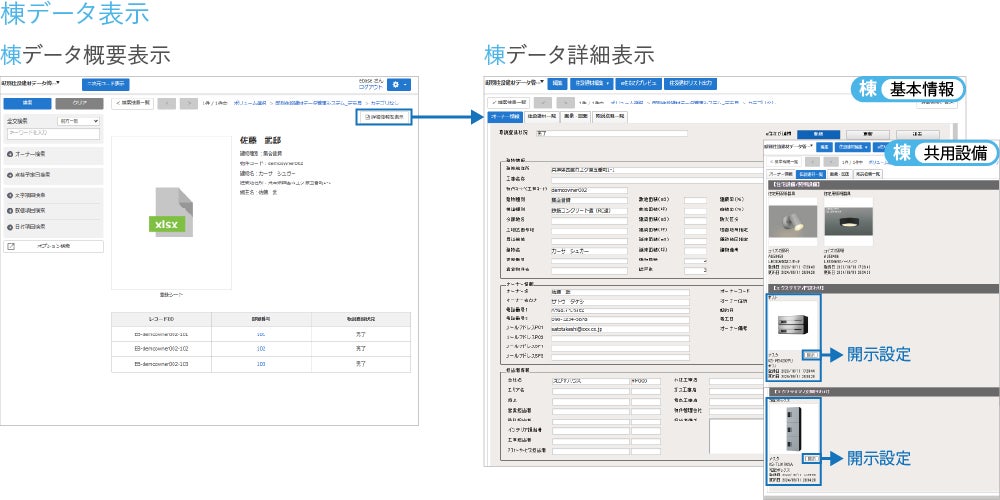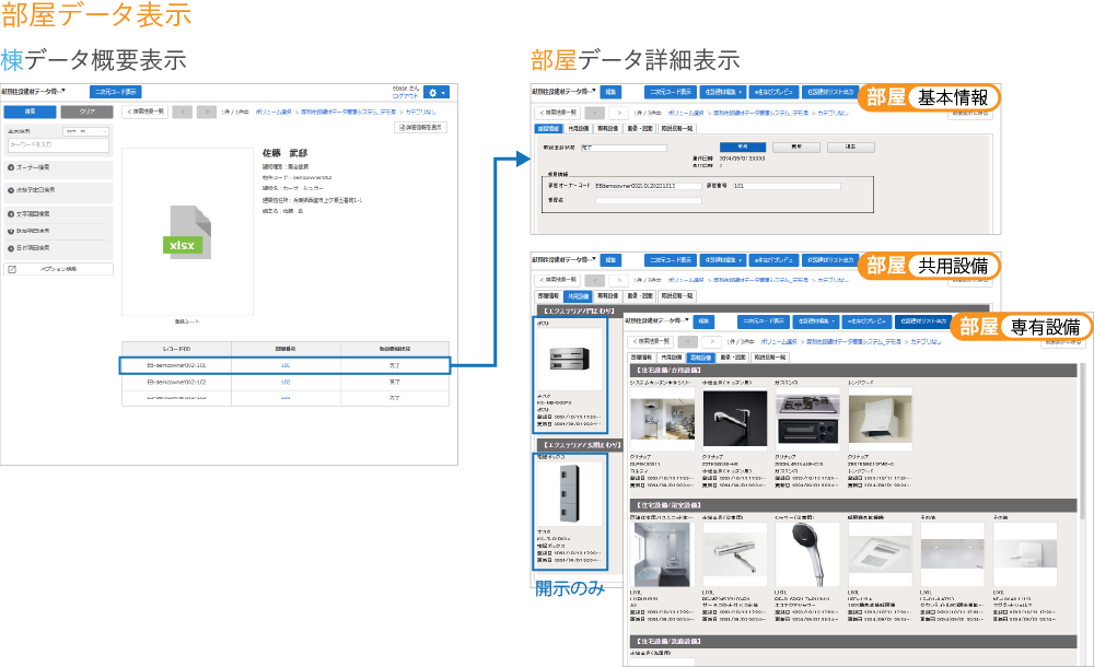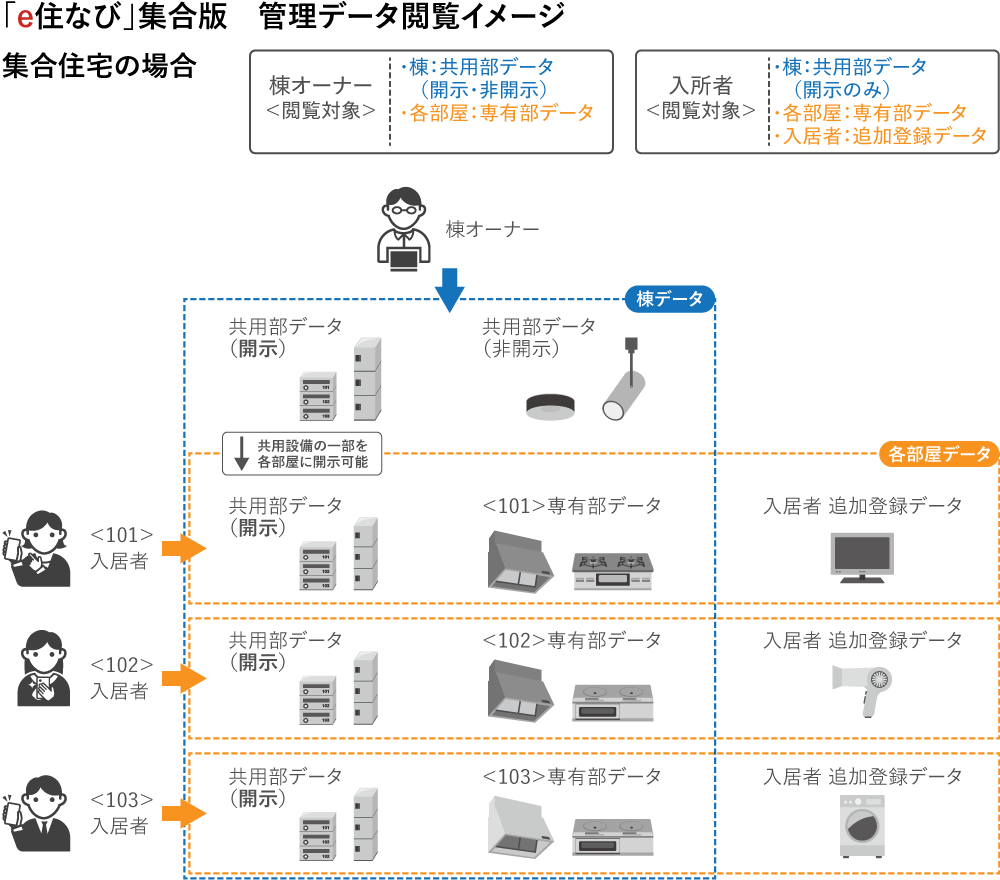 集合住宅オーナーは、共有設備および各戸の専有設備を閲覧可能、入居者は各戸の専有設備のみ閲覧可能