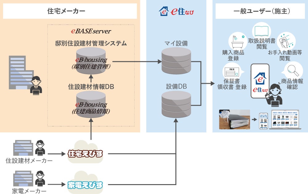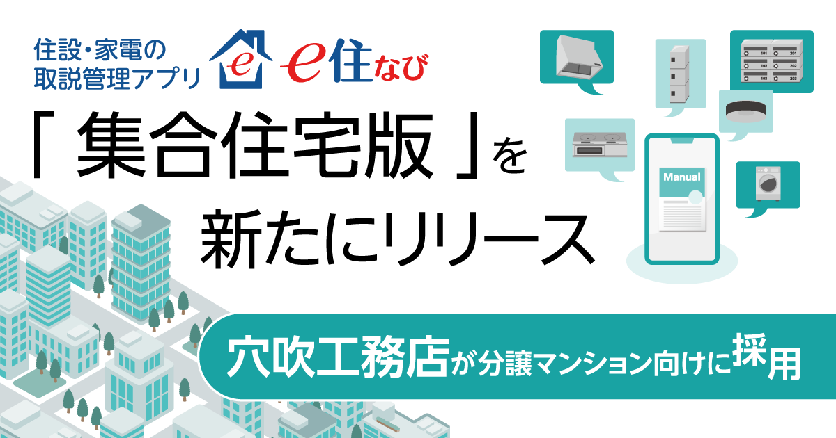 また、株式会社穴吹工務店(本社: 香川県高松市、代表取締役社長:竹本 勝/以下、穴吹工務店)が、分譲マンションの顧客向けとして、この集合住宅版アプリ「e住なび」、及び邸別住設建材管理システム/住設建材情報DBのクラウドサービス「HOUSING(ハウジング) eBASE Cloud」を採用しました。
