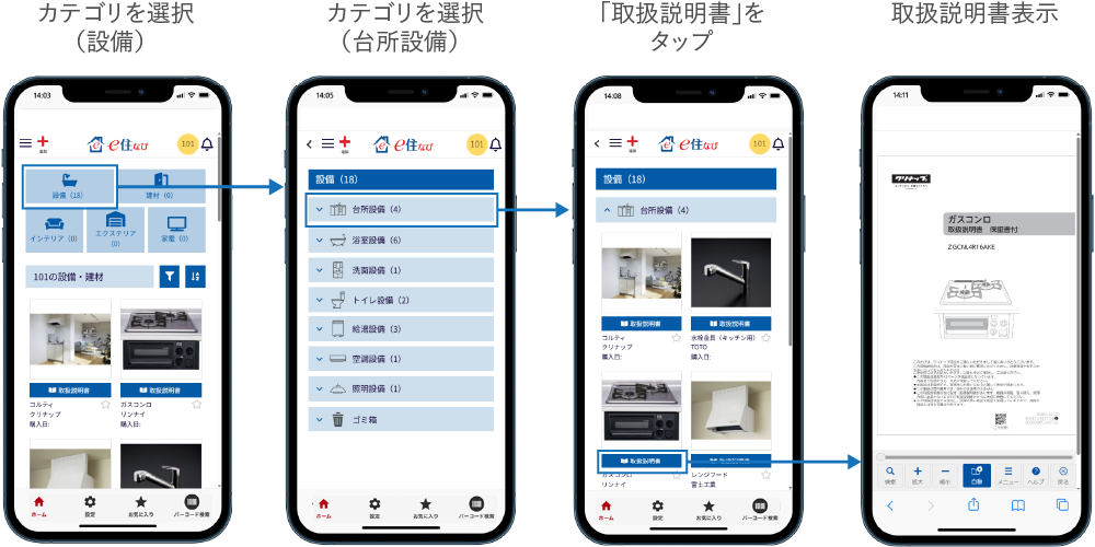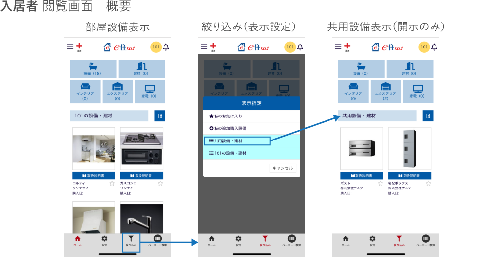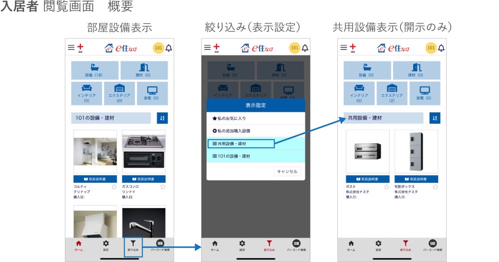 今回の機能改良により、集合住宅の入居者が「e住なび」で、各戸の専有設備や共用部の共用設備の使用方法を簡単に確認できるようになりました。