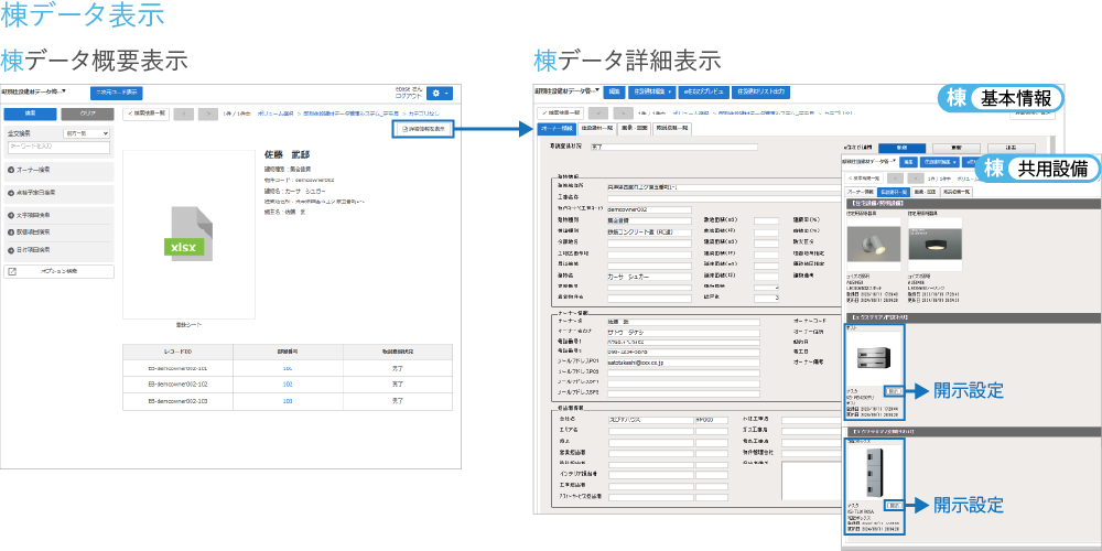 集合住宅の共有設備と各戸の専有設備を管理し、共有設備は各戸へ開示設定可能