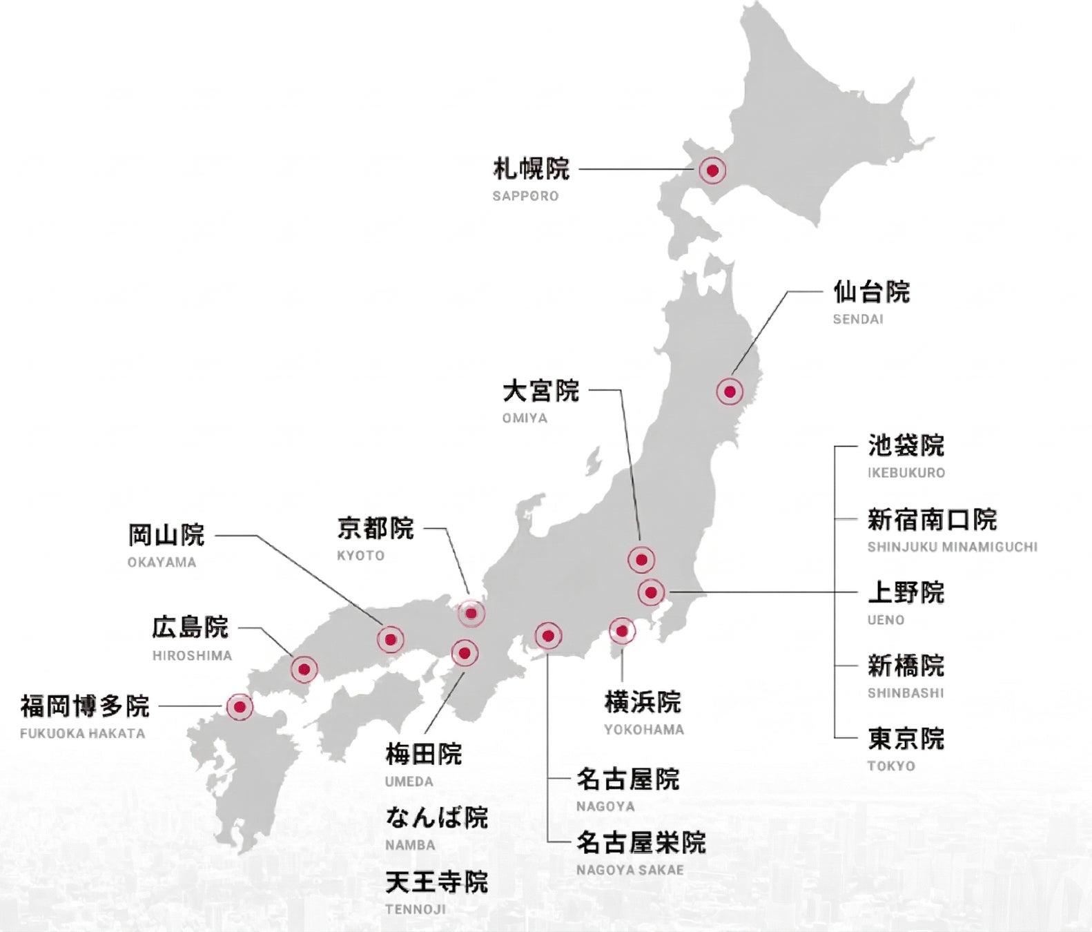 当グループは提携院を含め、北海道(札幌)、東北(宮城・仙台)、関東(東京、埼玉、神奈川)、中部(名古屋、栄)、関西(大阪、京都)、中国(広島、岡山)、九州(福岡・博多)と全国に19院展開しております。