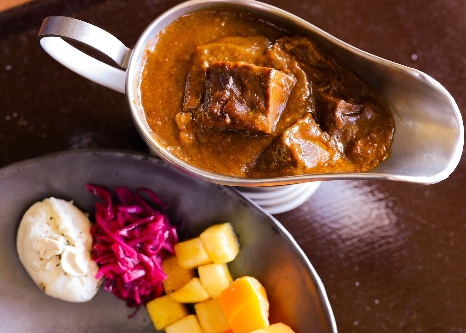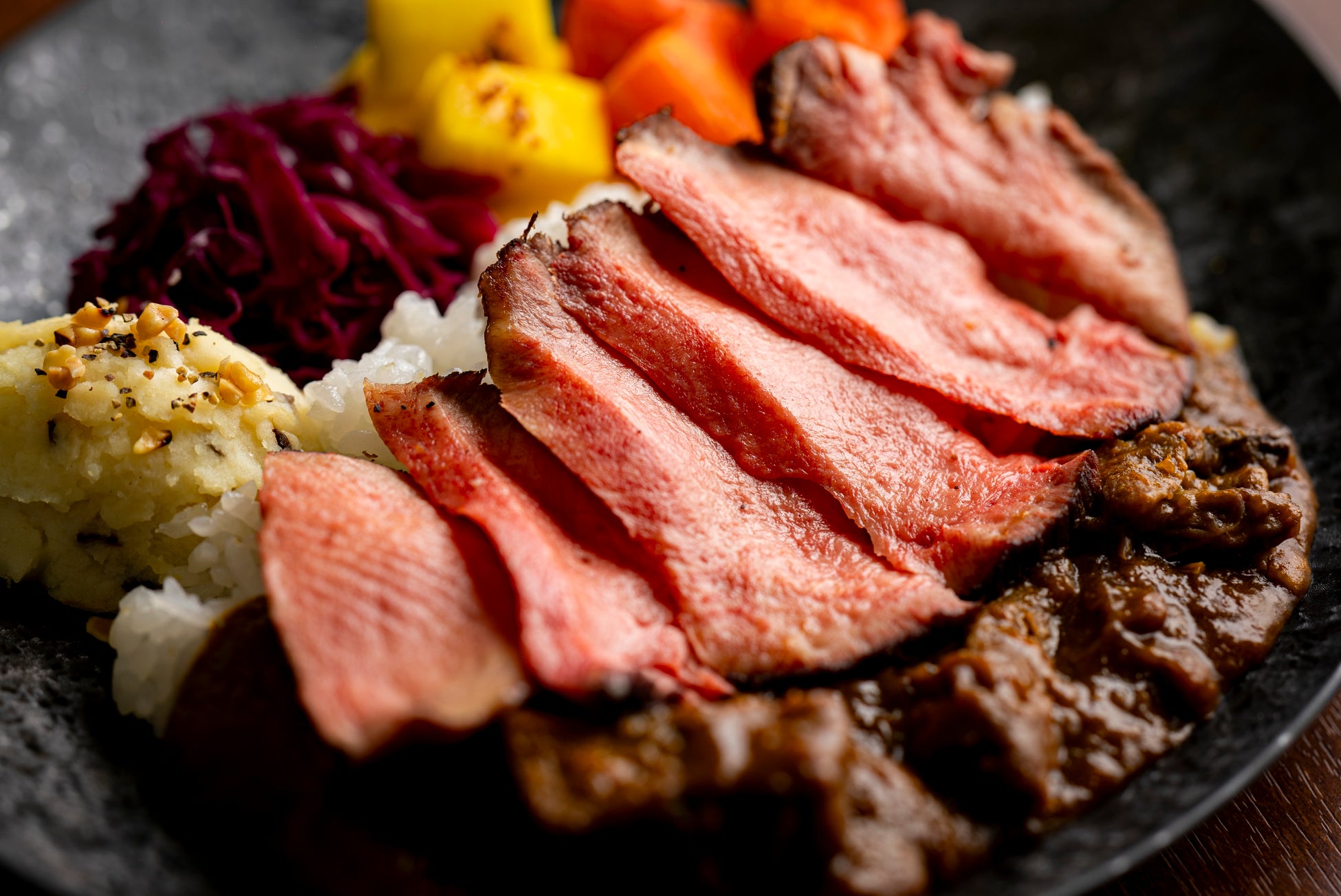外は香ばしく炙り、中はしっとりとしたレアな仕上がりに。肉厚だからこそ感じられる、噛むほどに溢れるジューシーな旨みと、とろけるような食感をお楽しみいただけます。スパイスが効いた濃厚ビーフカレーとの相性も抜群で、食べ応えをグンと上げてくれます。