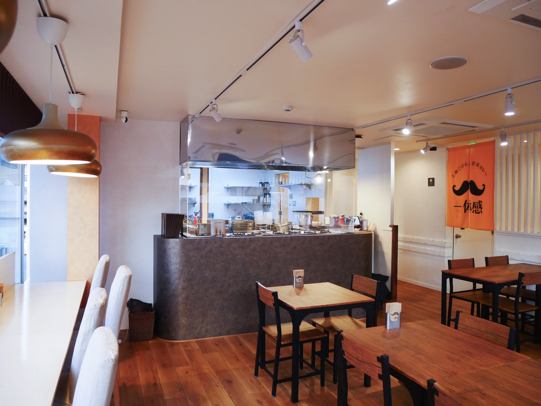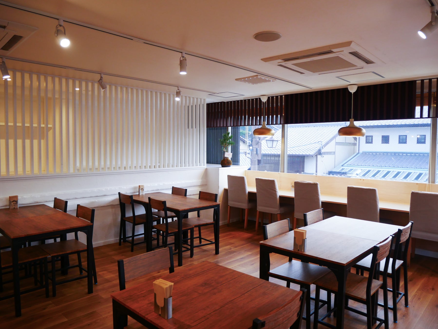 階段を上ると大通りが見下ろせるカウンター席、ゆったりと食事ができるテーブル席が広がります。