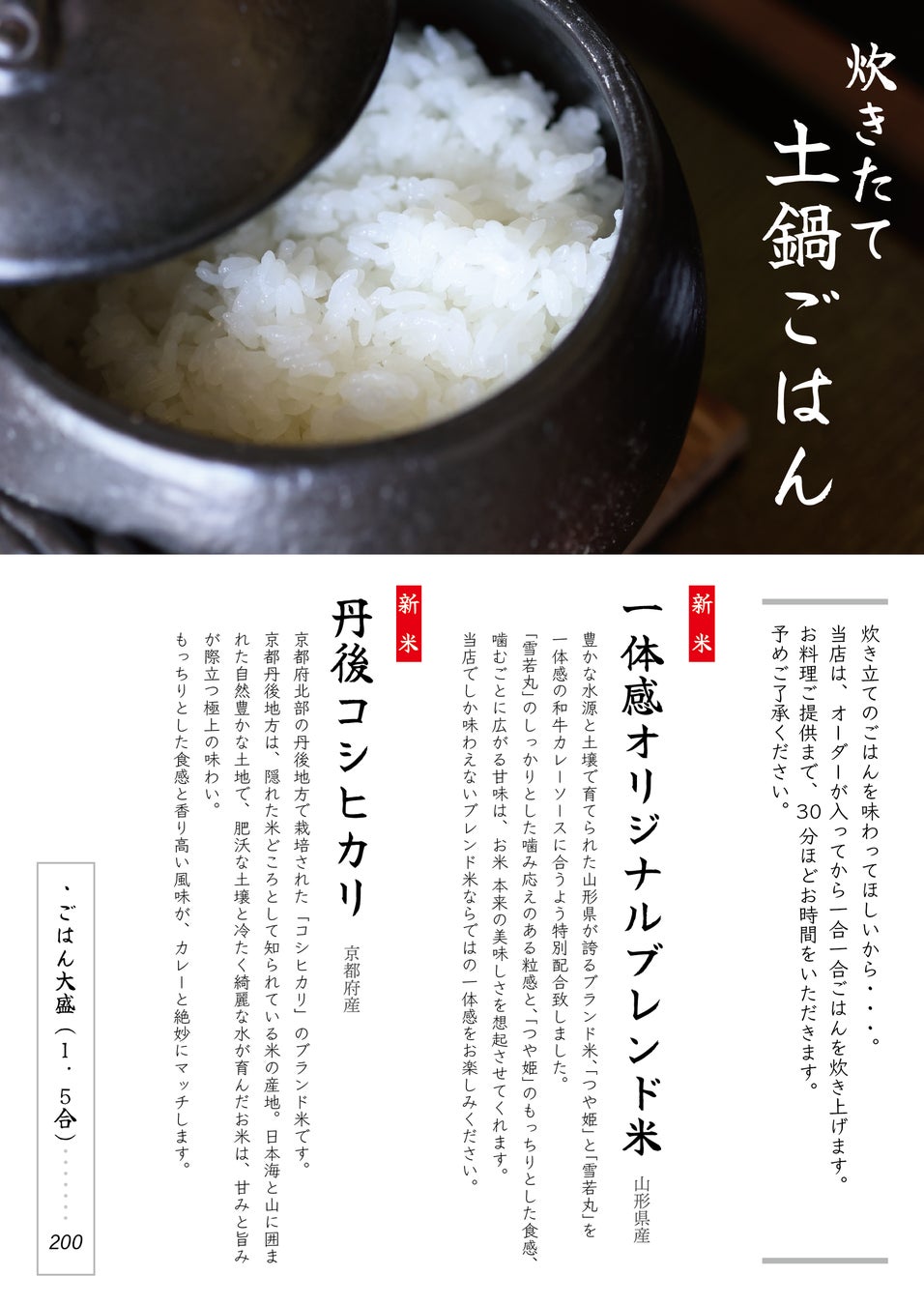 また、一体感ではお米にも高いこだわりをもち、土鍋で焚き上げ、カレーのインパクトにも負けない「コシ」・「甘み」・「旨味」を兼ね備えた大粒のごはんをご用意しています。