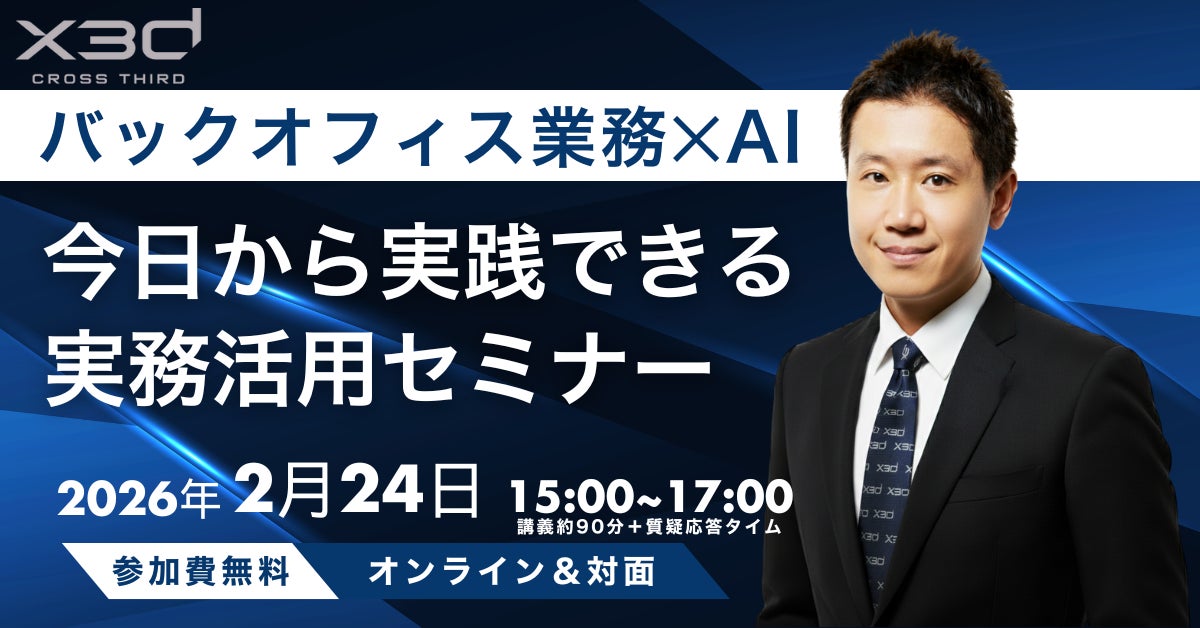人間中心のAI活用を軸に、企業へのAI実装支援やAI人材育成、組織開発を行うx3d株式会社(本社:東京都港区、代表取締役:武石 幸之助、以下 当社)は、バックオフィス業務の効率化をテーマとしたAI実務活用セミナーを、2026年2月24日(火)に開催いたします。本セミナーは、全国からオンラインでの参加が可能で、札幌大通近辺の会場では対面形式でも実施いたします。
