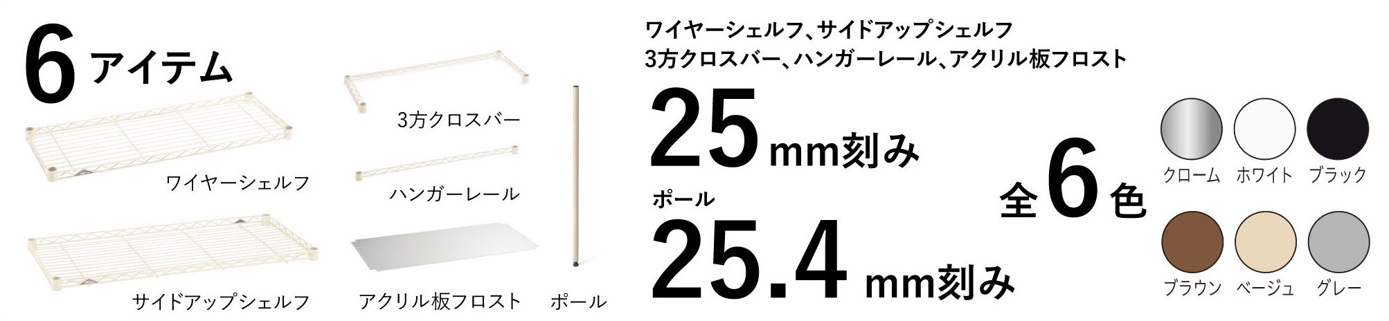 シェルフの間口サイズは25mm刻み、ポストの高さは1インチ(25.4mm刻み)、幅広いインテリアに調和する厳選カラー6色から選べます。