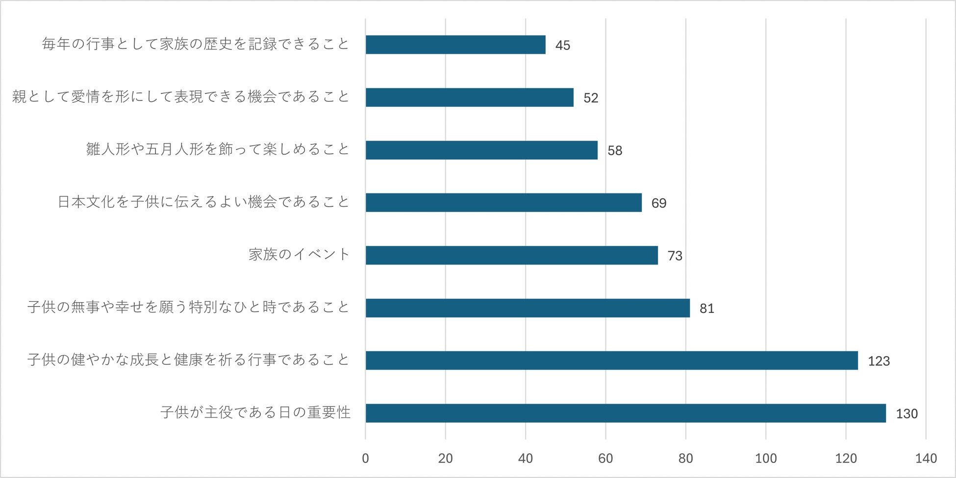 ひな祭りやこどもの日などの節句祝いについて、「子供が主役である日の重要性」と答えた方が最も多く、130名(13%)に上りました。多くの方にとって、節句祝いは誕生日などと同様に、子供が中心となる特別な日と認識されています。また「子供の健やかな成長と健康を祈る行事であること」や「子供の無事や幸せを願う特別なひと時であること」にも多くの回答が集まり、大人にとっても節句行事が意義あるものと考えられているのがわかります。