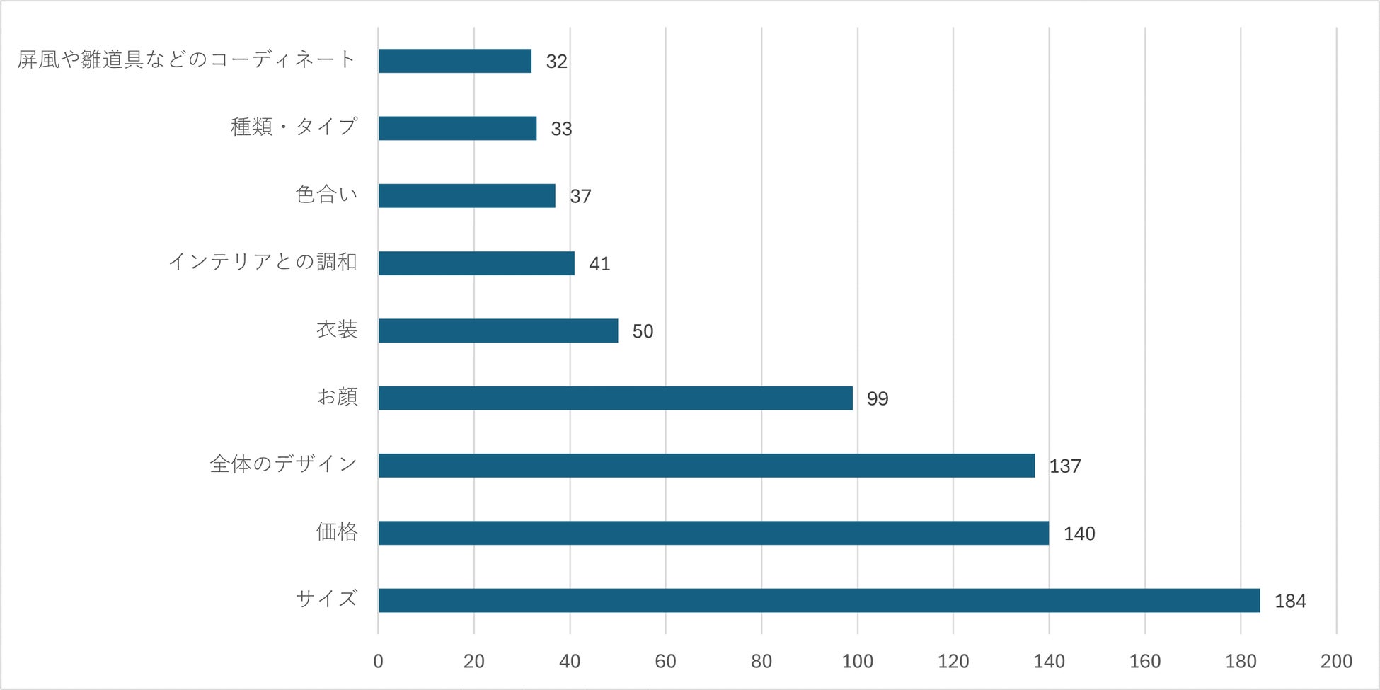 次いで「全体のデザイン」が59名(20%)と高い割合を示しており、「価格」が42名(14%)と続きました。価格も重要ではありますが、一生ものとして選ぶ雛人形では、価格以上にサイズやデザインを優先する方のほうが多い傾向が見られます。また、「お顔」も価格と同程度の票数が集まっており、購入者のこだわりがうかがえます。