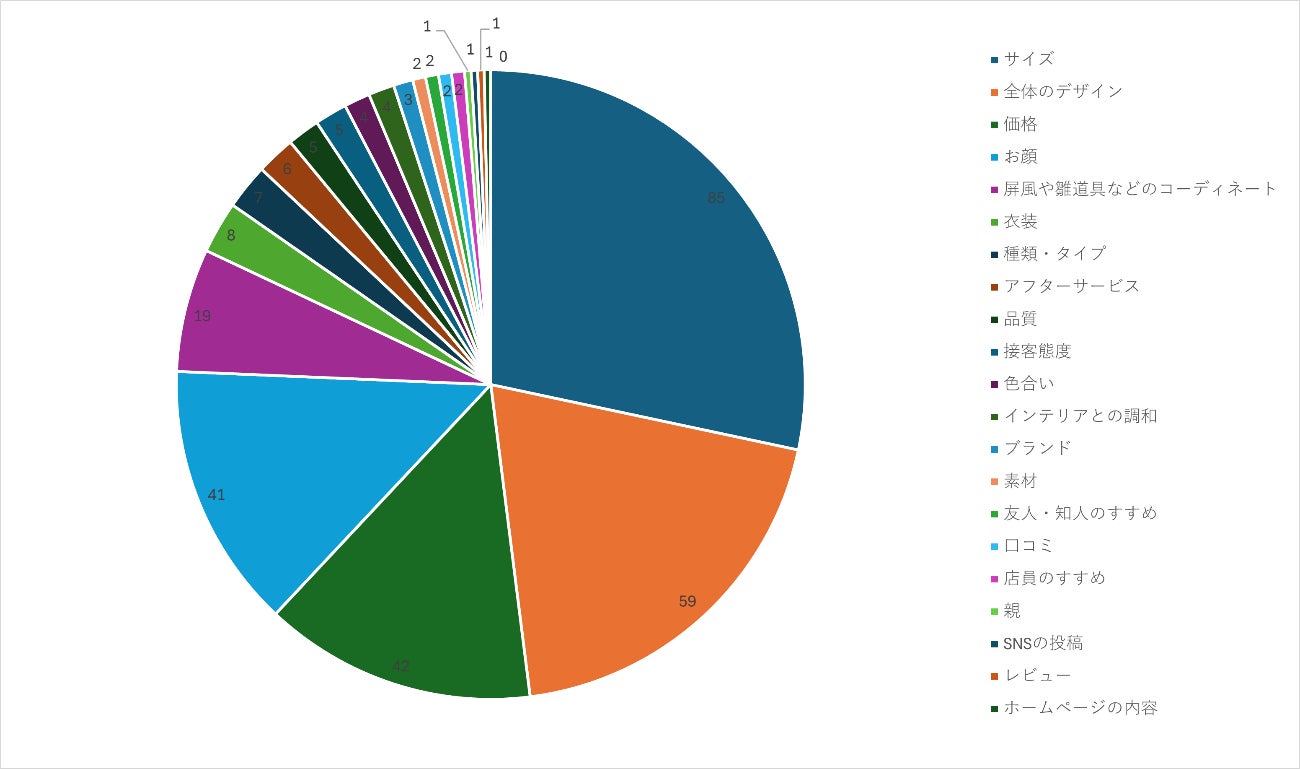 同じように、Q4、Q5の回答数を合わせると「価格」は182名、「全体のデザイン」は196名となり、それぞれ過半数の回答者が重視しているのがわかります。「お顔」もQ4、Q5を合わせて140名と過半数に迫る結果となりました。一方で、それ以外の要素に対する回答は少なく、特定のこだわりを持つ一部の方が重視している印象です。