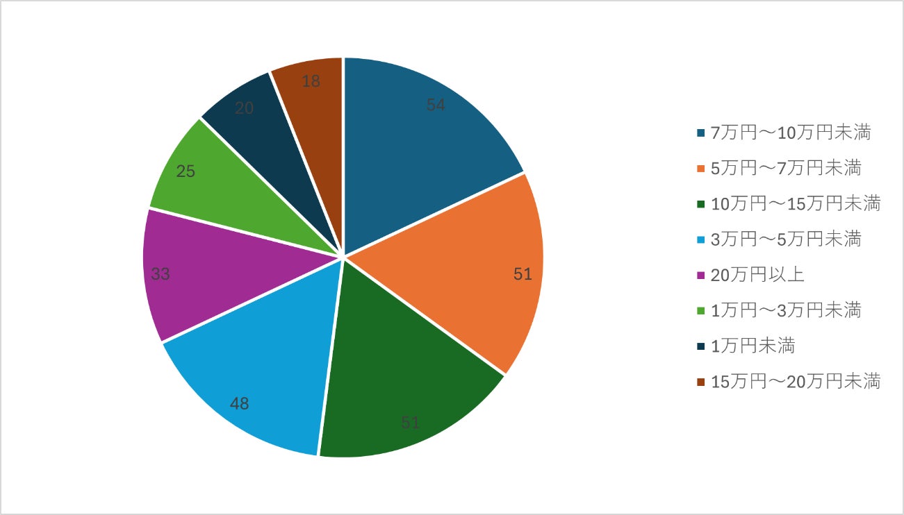 雛人形に使う予定、または実際に使った金額の分布は広範囲にわたっています。「7万円~10万円未満」が最も多い54名(18%)の回答となりましたが、「5万円~7万円未満」「10万円~15万円未満」も同程度の回答数が集まっており、5万円から15万円の範囲が全体の過半数を占めています。この結果から、雛人形に比較的高い予算を設定する傾向があるといえるでしょう。