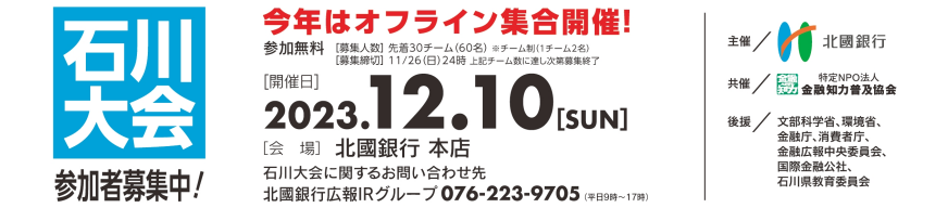 北國銀行は、「エコノミクス甲子園石川大会」を2023年12月10日(日)に開催します。本年は、4年ぶりのオフライン開催!高校生活の思い出作り、金融知識の向上、全国大会出場を目指して出場しませんか?