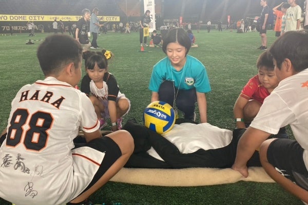 同じく球出し役を務めた、木下アビエル神奈川の牧野美玲選手(中央)。「災害に打ち勝とう!」と、災害(火事、雷、台風)に見立てた的をめがけて打ちます。すべて打ち倒せたお子さんもいました