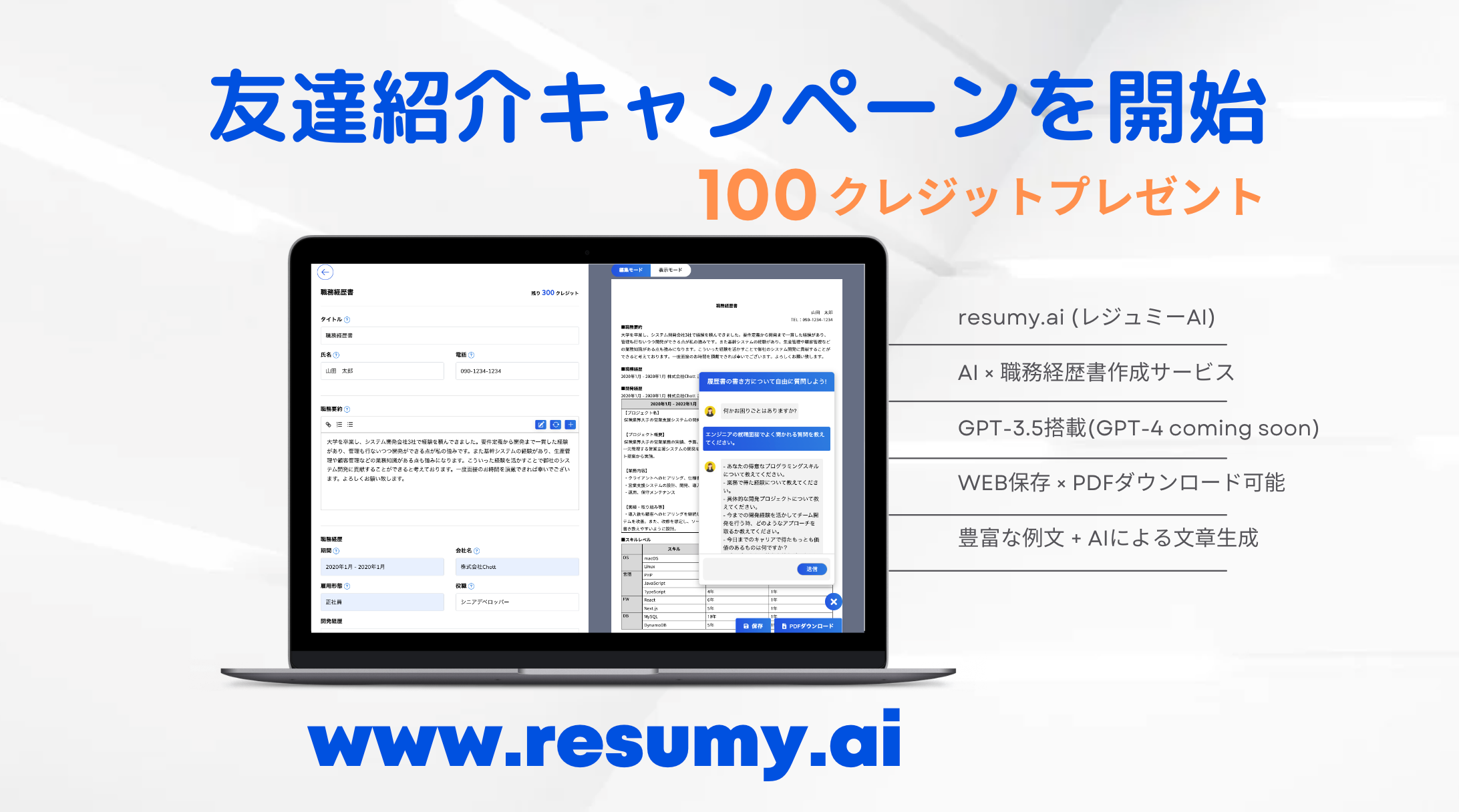 AI技術を駆使し、簡単・迅速にプロフェッショナルな履歴書・職務経歴書を作成できるサービス「レジュミーAI(https://www.resumy.ai)」が、新たに友達紹介キャンペーンを開始いたしました。このキャンペーンは試験的に導入され、友達を紹介した方には100クレジット、招待された方には50クレジットがプレゼントされます。