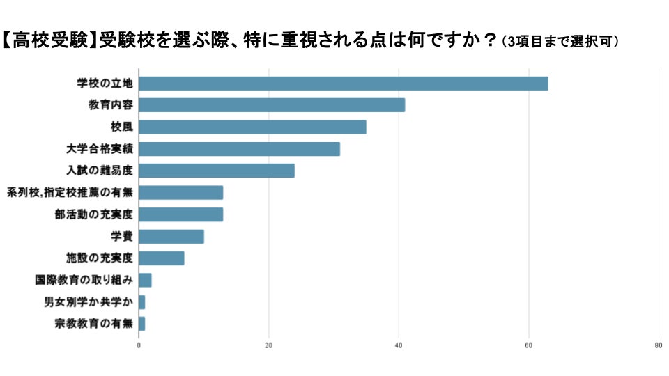 高校受験において、志望校を選ぶ際に重視する点について聞いたところ、最も選択された「学校の立地」に続き、「教育内容」「校風」が選択されました。