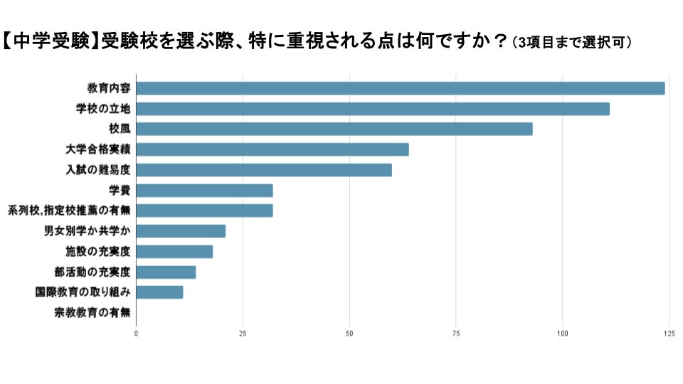 中学受験において、志望校を選ぶ際に重視する点について聞いたところ、最も選択された項目は「教育内容」。次に「学校の立地」「校風」が続きました。