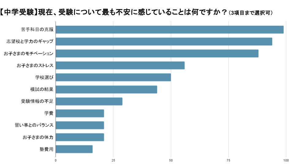 「学力」と「気持ちの面」での不安に大きな差はなく、高校受験において子どものモチベーションをあげることが大きな課題となっていることがわかりました。