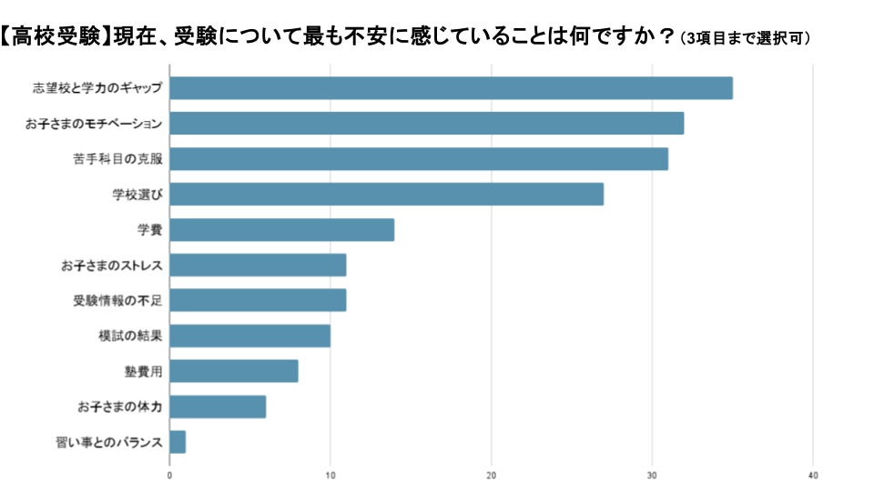 高校受験で不安に感じていることとして最も回答が多かったのは「志望校と現在の学力のギャップ」。次いで「お子さまのモチベーション」となっていました。