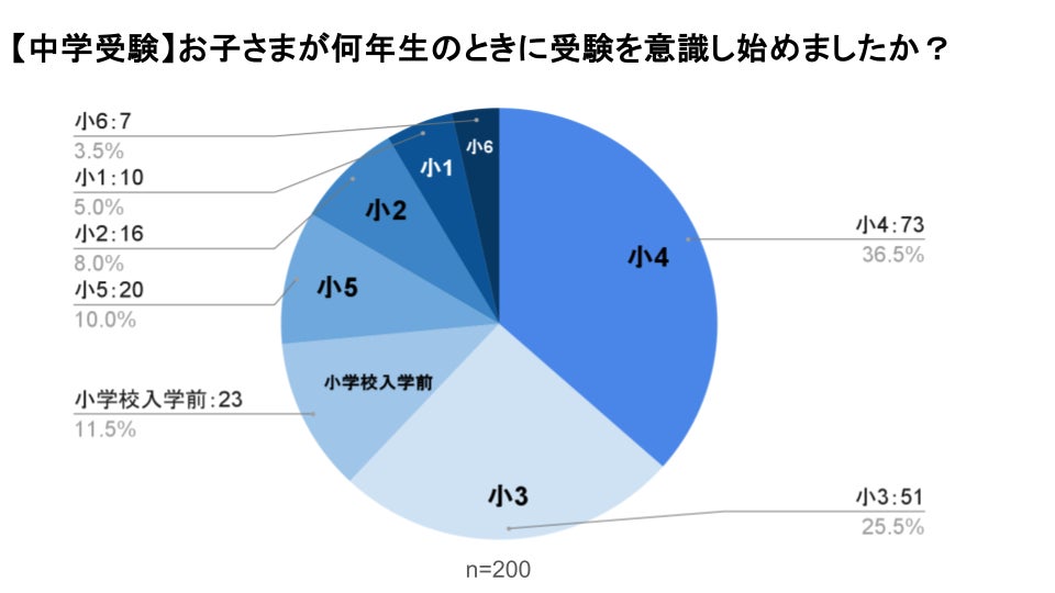 小学生とその保護者に、最初に中学受験を意識した時期を聞いたところ、36.5%が「小学校4年生」と回答しました。次いで、「小学校3年生」が25.5%となっており、6割以上の家庭で小学校中学年で受験を意識し始めたことがわかりました。
