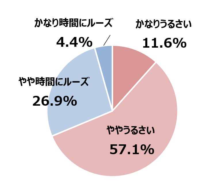 では、「時間」に対する意識はどうなっているのでしょうか。待ち合わせなどの時間への意識を聞いてみたところ、半数以上の57.1%が「ややうるさい」と回答。「かなりうるさい」とした11.6%を合わせると、およそ7割近くが「時間に厳しい」傾向があることがわかります。一方で、「やや時間にルーズ」とした人も26.9%と一定数おり、4人に1人は時間に対してある程度寛容であることも見えてきました。性年代で大きな差は見られなかったものの、50代女性に限ってみると「ややうるさい」が71.0%と、全体より13.9ポイントも高く、より時間意識が強い世代であることがうかがえます。